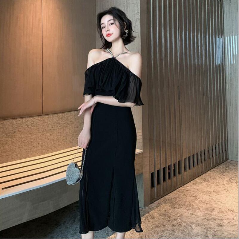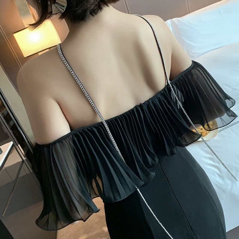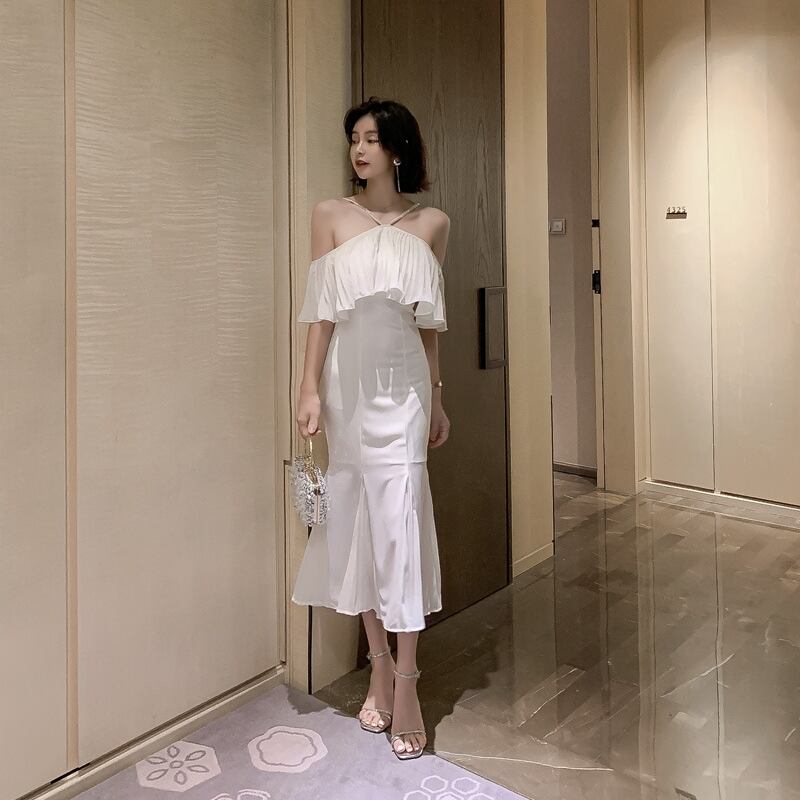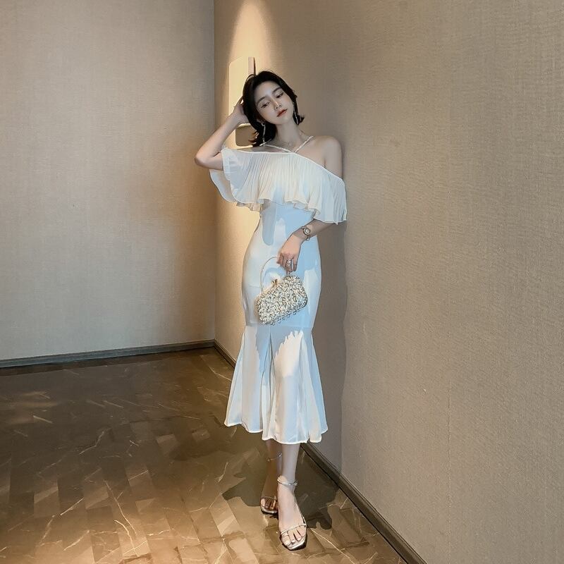 全2色 ワンピース フリル スリング ドレス ワンピ ロング フィッシュテール ビーズ 肩紐 オフショルダー オフショル マーメイド 無地 シンプル エレガント かわいい ナイトドレス パーティー ゴージャス 大人 色気 セクシー キャバ嬢 お呼ばれ 春 夏 モノトーン
