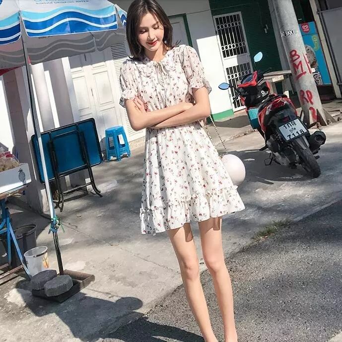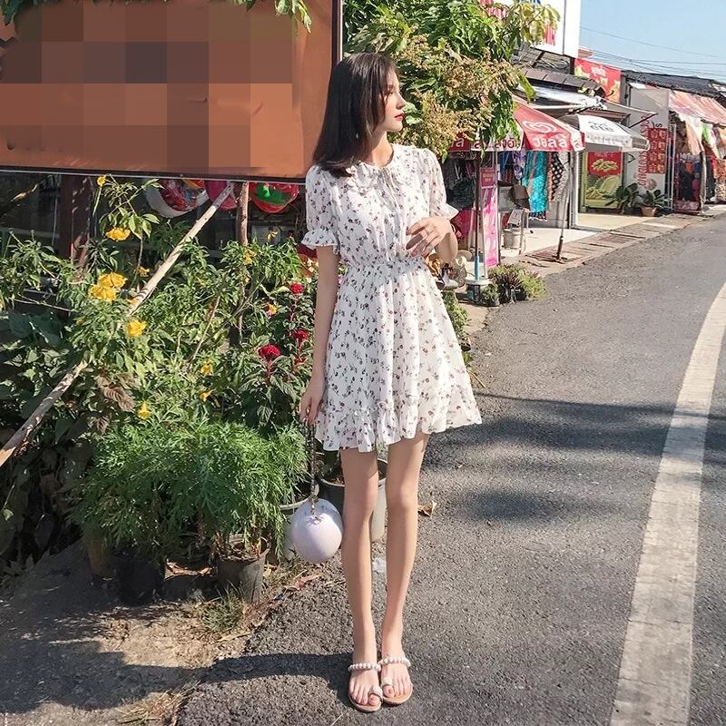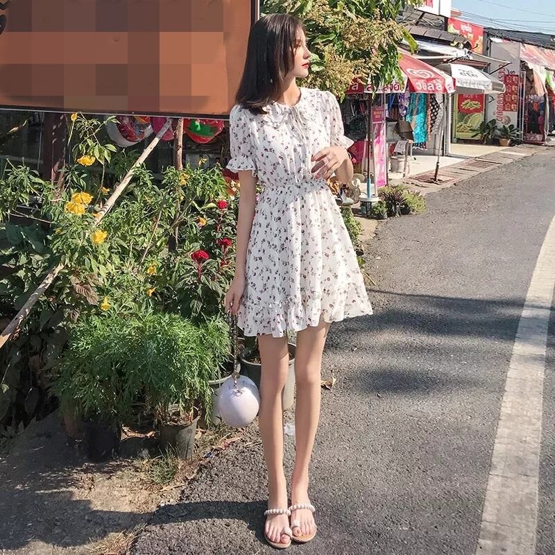花柄 ワンピース ワンピ ミニ フラワー 小花柄 リボン フリル フレア Aライン 半袖 パフスリーブ ハイウエスト 襟 ボタン 白 ホワイト レディース 女子会 かわいい レトロ ガーリー デート おでかけ 春 夏