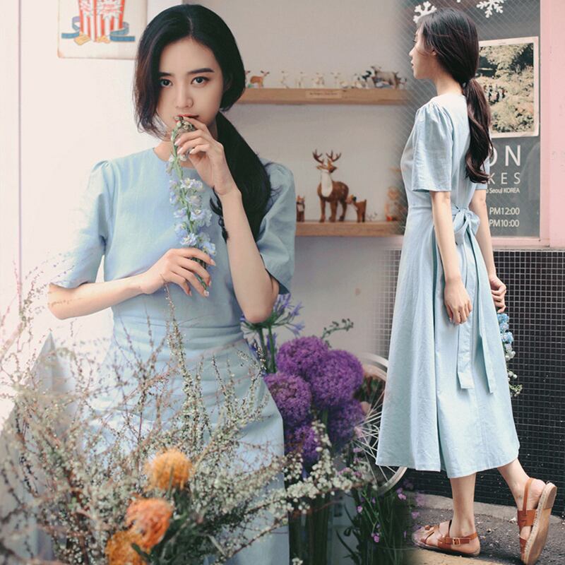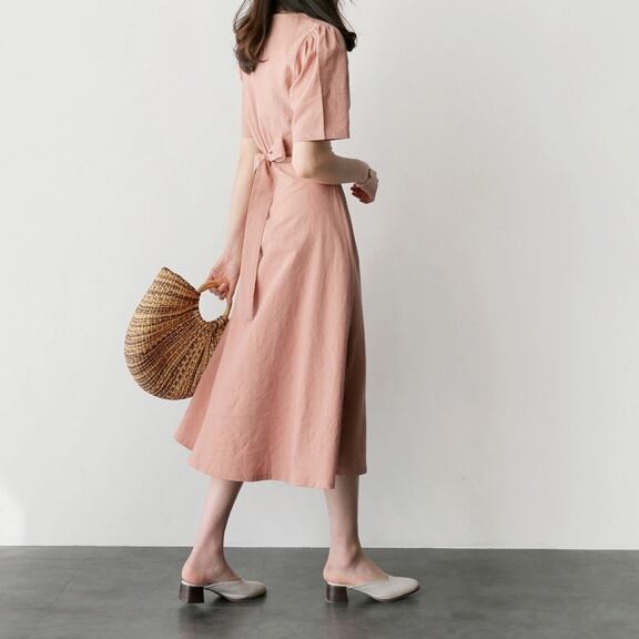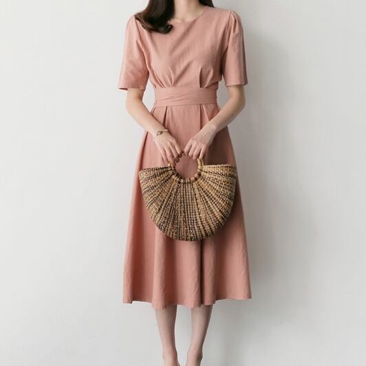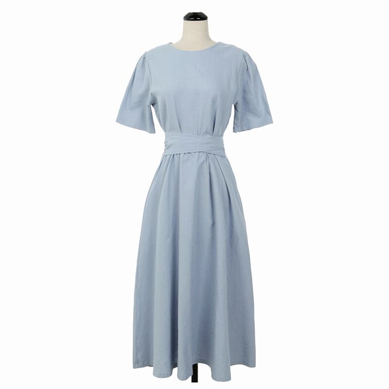 5分袖のラウンドネック、ウエストマークにリボンが可愛く、バックジップ仕様のワンピースになります。