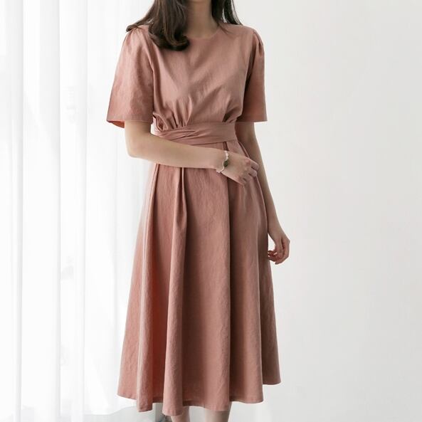 全3色 ワンピース 無地 シンプル 5分袖 ウエストマーク リボン ジップ ファスナー Aライン ロング ワンピ 美ライン 大人 かわいい エレガント 上品 ガーリー おしゃれ おでかけ デート 女子会 春 夏