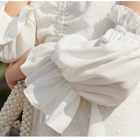 ボリューム袖が愛らしく、オープンショルダーで気になる二の腕をカバーしながら
