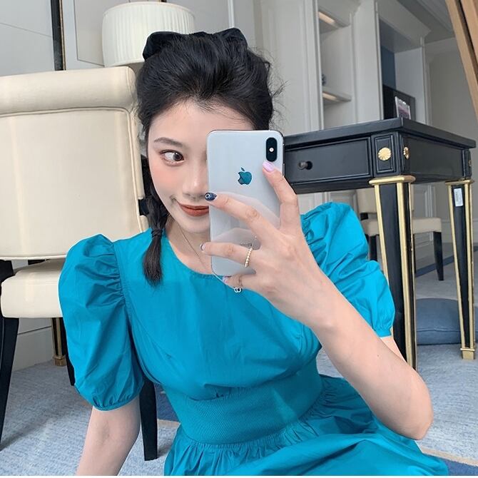 バブルスリーブの半袖がレトロかわいく、ハイウエストが美ライン効果抜群のAラインワンピースです。