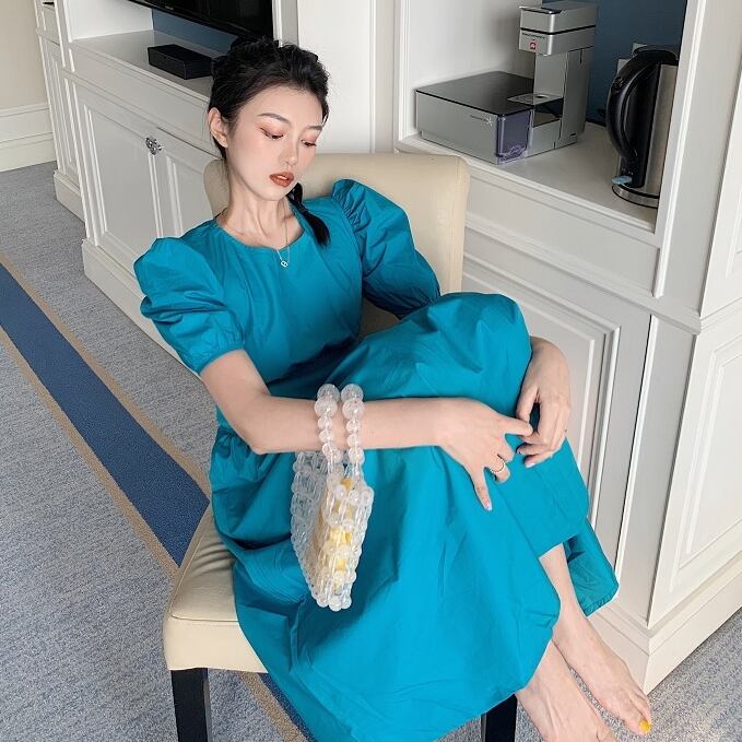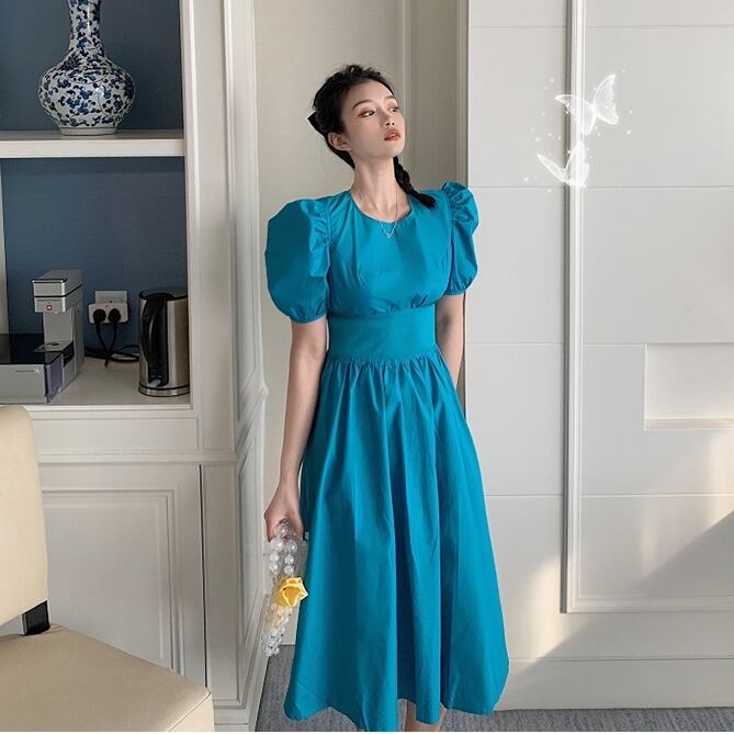 全2色 ワンピース パフスリーブ 半袖 ウエストマーク ラウンドネック 無地 シンプル 膝下 ロング ワンピ バブルスリーブ ハイウエスト 春 夏 秋 レディース レトロ かわいい おしゃれ クラシカル シック 大人 かわいい