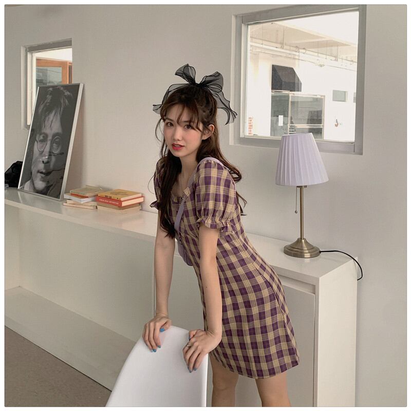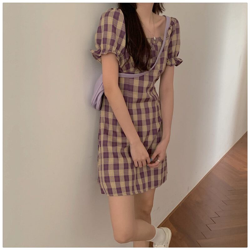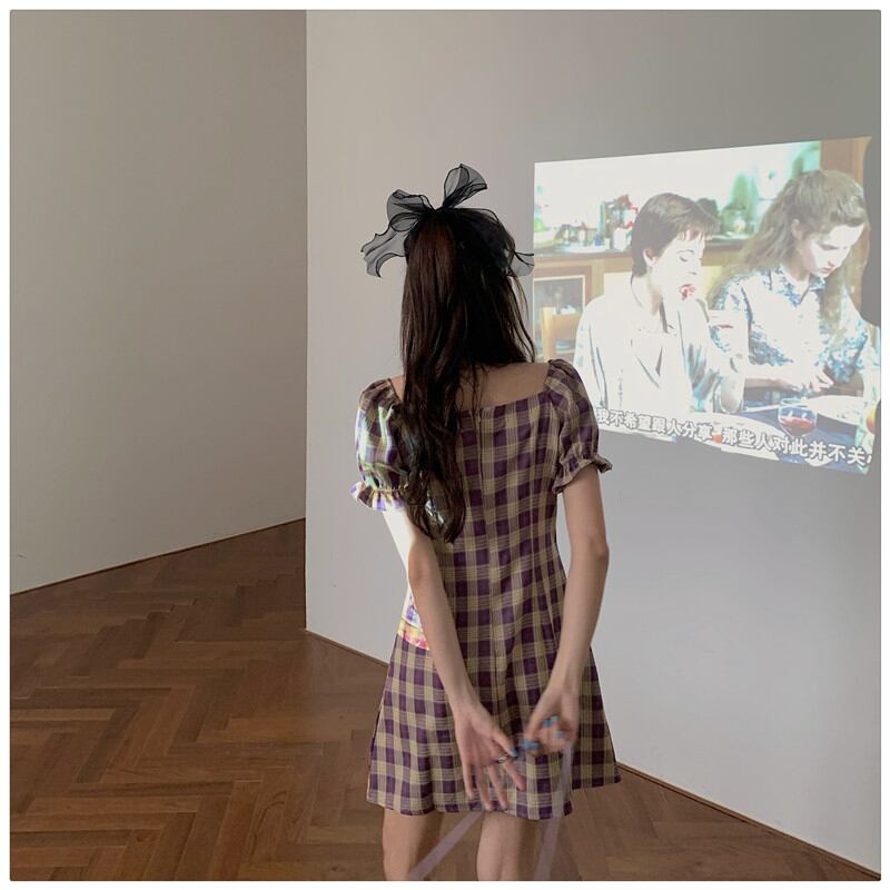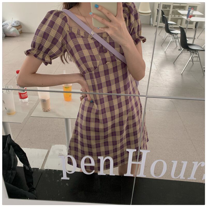 チェック柄 オフショル ワンピース スクエアネック フロントボタン パフスリーブ ハイウエスト Aライン 半袖 ワンピ ショート丈 可愛い 大人可愛い レディース ガーリー レトロ フェミニン キュート お出かけ 通勤 買い物 旅行 デート 女子会 夏