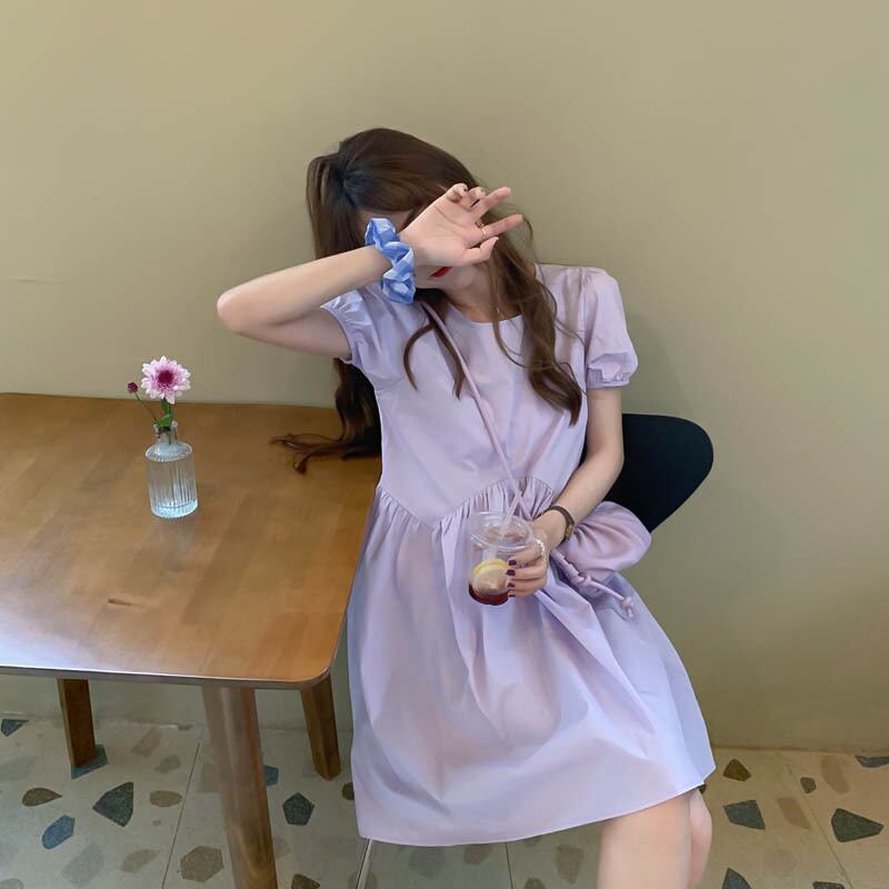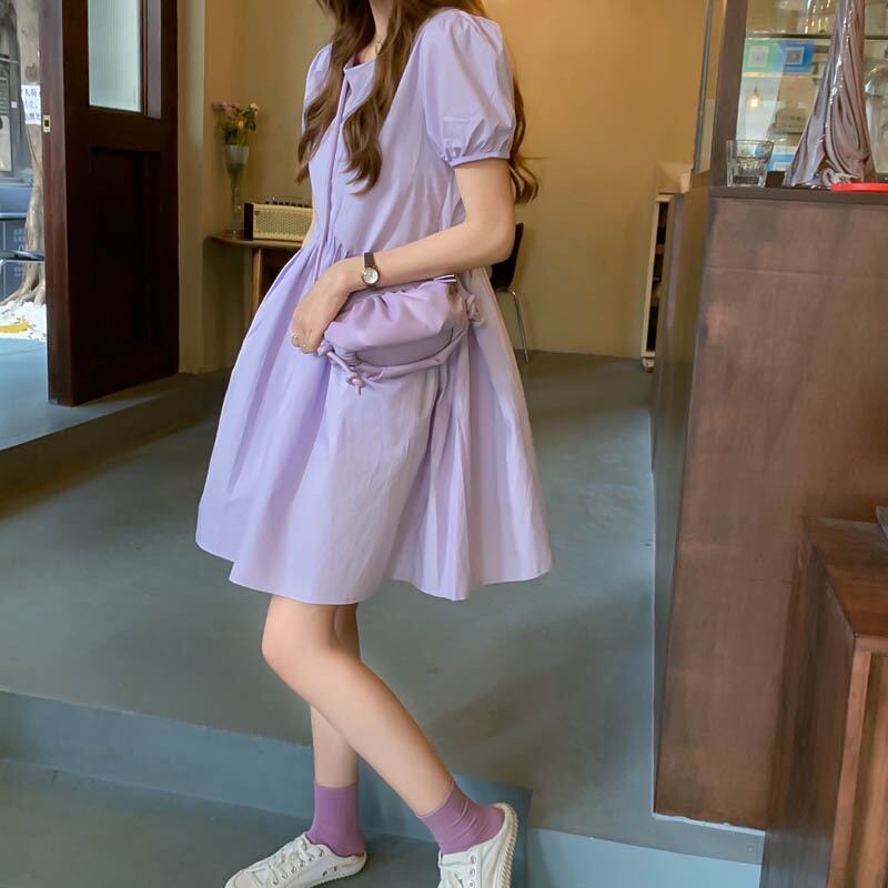 全2色 無地 フレアワンピース ラウンドネック ゆったり ウエストタック ハイウエスト Aライン パフスリーブ 半袖 ワンピ ショート丈 可愛い 大人可愛い レディース ガーリー レトロ フェミニン キュート 清楚 上品 お出かけ 通勤 買い物 旅行 デート 女子会 夏