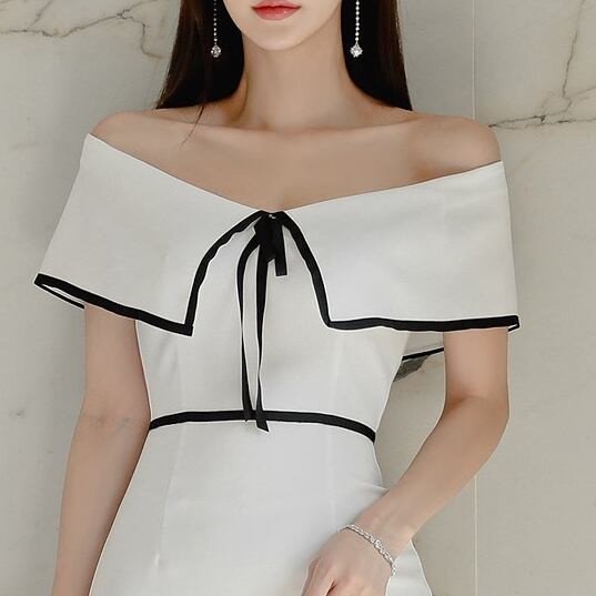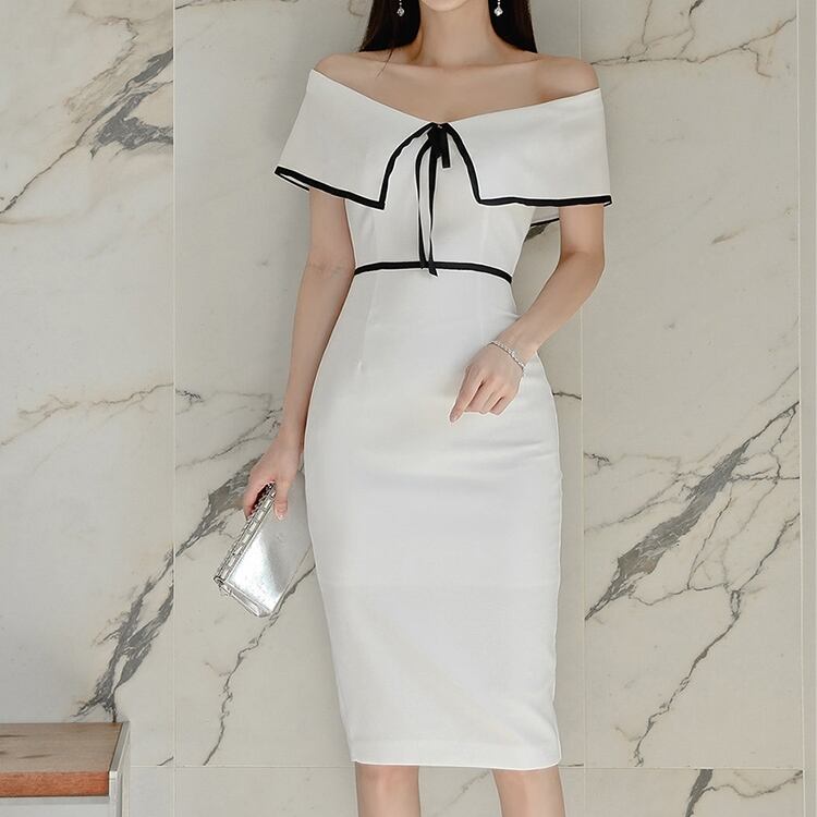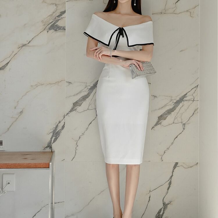 ワンピース オフショルダー オフショル ワンピ リボン モノトーン パイピング ひざ丈 ミドル丈 ウエストマーク ハイウエスト 美デコルテ お呼ばれ 大人 レディース 上品 エレガント パーティー フォーマル 春 夏