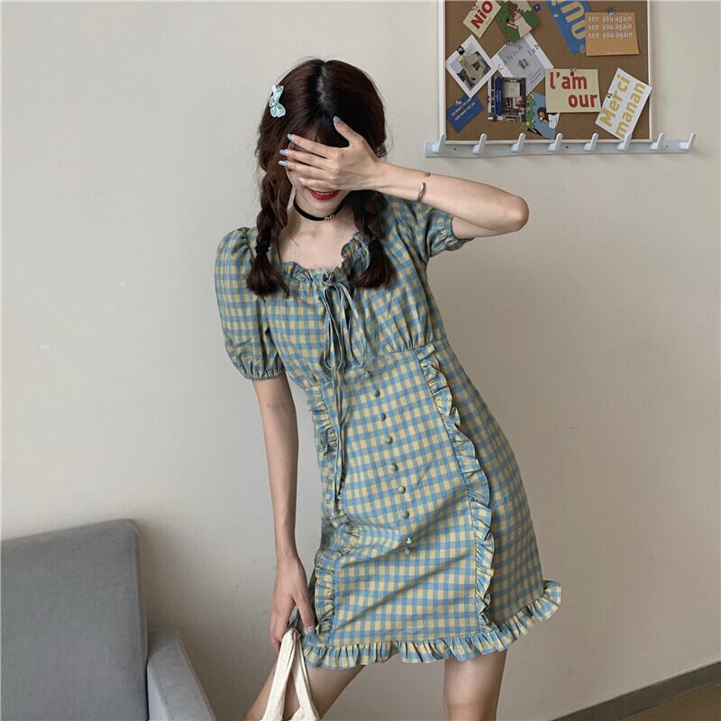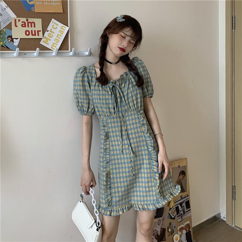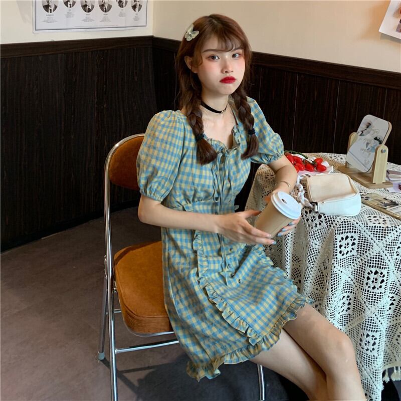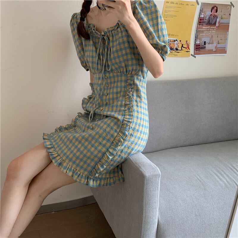 ワンピース チェック柄 フリル 半袖 パフスリーブ ハイウエスト リボン ボタン 膝上 ミニ ワンピ ガーリー レトロ かわいい 妹コーデ 春 夏 韓国 女子 レディース