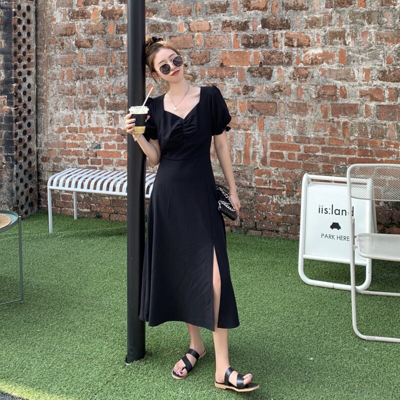 全2色 ワンピース ロング ワンピ 半袖 パフスリーブ バブルスリーブ スリット Vネック フリル フレア ストライプ リーフ柄 シンプル 上品 エレガント おしゃれ 旅行 女子会 レディース 大人 春 夏