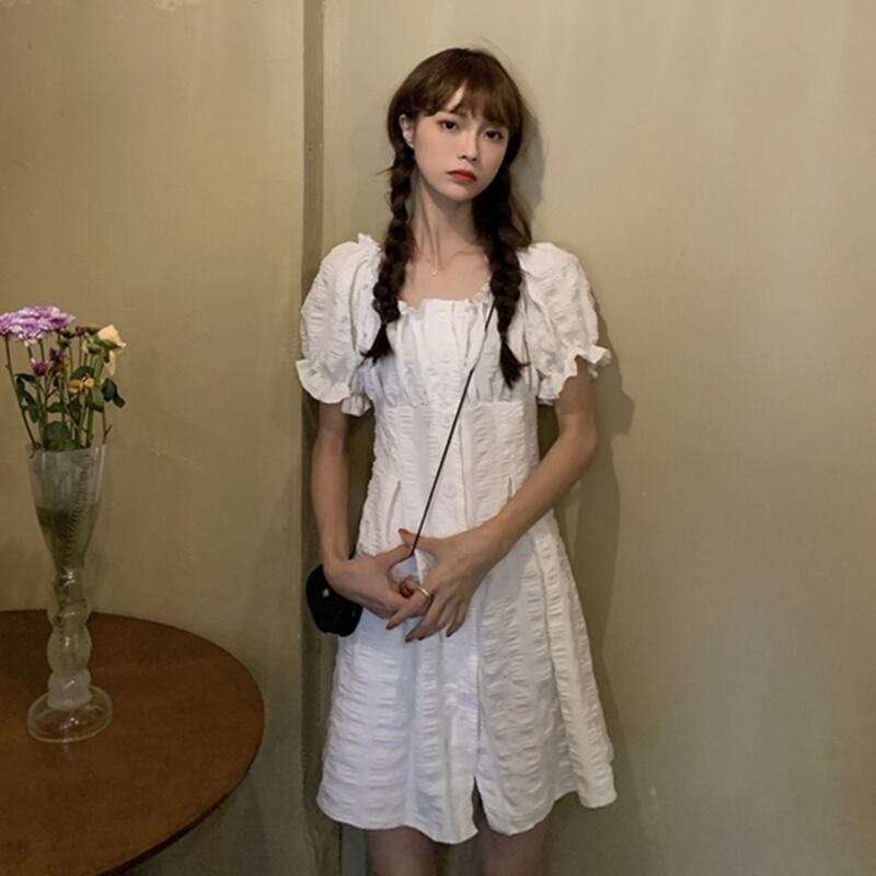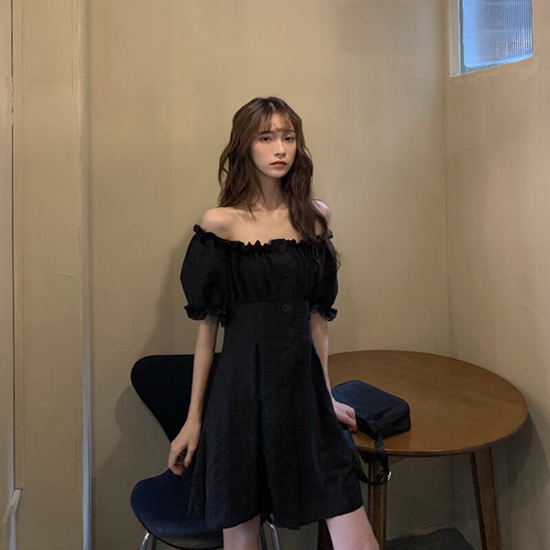 全2色 ワンピース フリル フレア ミニ Aライン オフショルダー ギャザー オフショル ボタン ハイウエスト レディース 大人 かわいい 無地 シンプル パフスリーブ 春 夏 ガーリー フェミニン