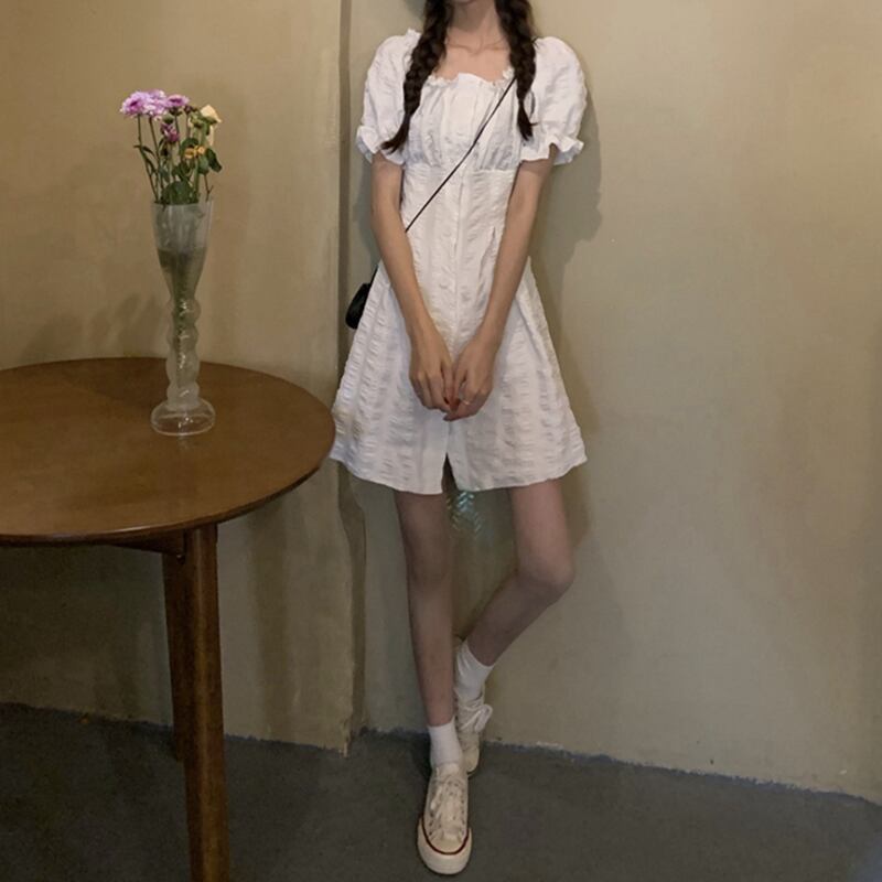 フロントに大きめのボタンが施され、ハイウエストのAラインミニワンピースは
