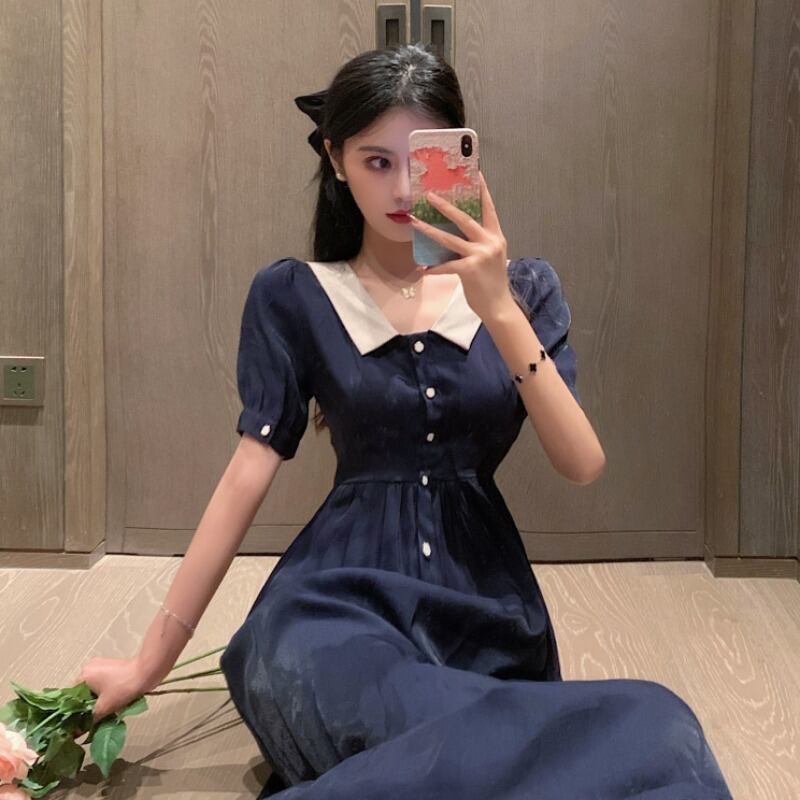 ワンピース 襟 Vネック ボタンダウン ハイウエスト Aライン 膝下 ロング ワンピ 光沢感 フレンチ レトロ 大人 クラシカル シック かわいい 上品 エレガント 無地 シンプル 春 夏