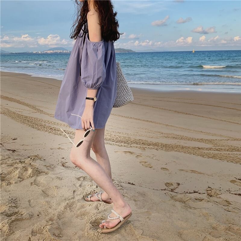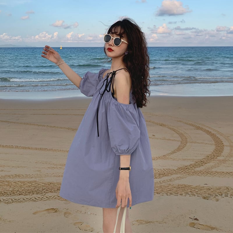 全2色 ワンピース デタッチスリーブ オフショル オープンショルダー ミニ ワンピ Aライン 無地 リボン 肩紐 シンプル 旅行 デート おでかけ かわいい レジャー ビーチ リゾート おしゃれ 上品 エレガント 春 夏