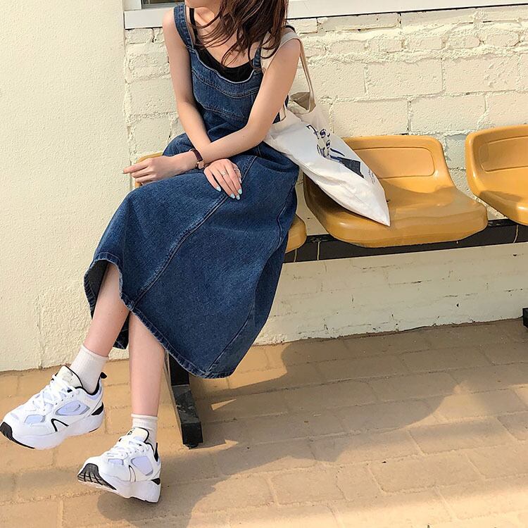 デニムワンピース ジャンパースカート フレア フロントタック ハイウエスト バックジップ Aライン ノースリーブ ワンピ ミモレ丈 可愛い 大人可愛い レディース ガーリー レトロ カジュアル キュート お出かけ 通勤 買い物 旅行 デート 女子会 夏