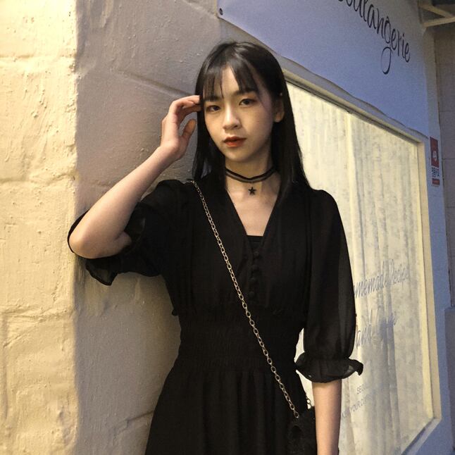 ワンピース Vネック 七分丈 ボタン ウエストゴム ロング ワンピ 無地 シンプル シフォン シースルー おしゃれ マニッシュ モノトーンコーデ おしゃれ ゴシック クラシカル かわいい 大人 上品 エレガント 春 夏