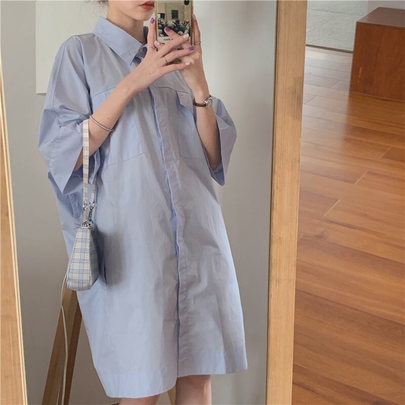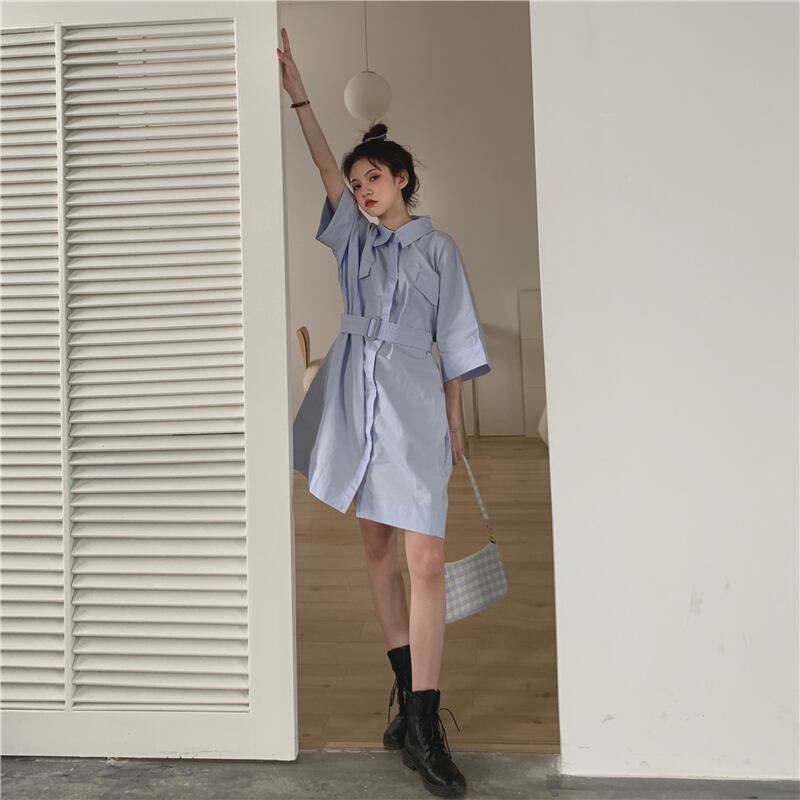 ワンピース シャツワンピ ひざ丈 七分袖 フレア Aライン ウエストマーク ベルト ポケット 無地 シンプル カジュアル ガーリー ビジネス オフィス オーバーサイズ ゆったり ブルー 青 春 夏 レディース かわいい エレガント