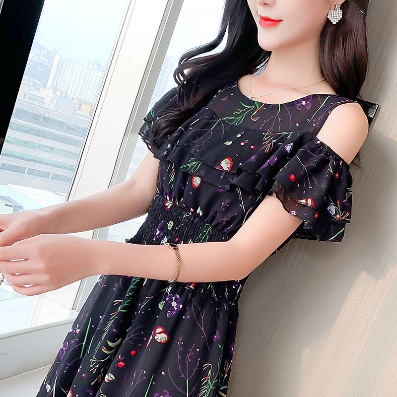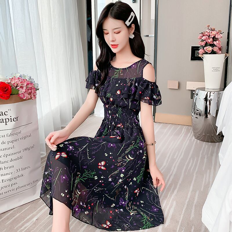 ワンピース シフォン 花柄 フリル ノースリーブ ウエストゴム シースルー オープンショルダー フレア フェミニン かわいい フラワー 大人フローラル 上品 エレガント ネイビー 韓国 春 夏