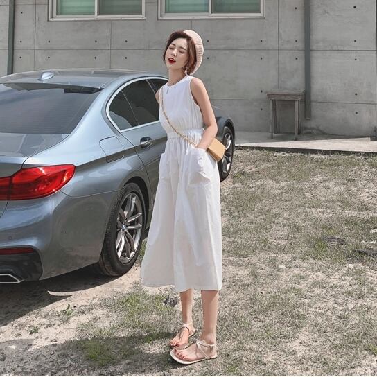 全2色 ワンピース ロング 膝下 ワンピ ノースリーブ ギャザー シンプル 無地 ナチュラル ラウンドネック ポケット カジュアル 大人 お呼ばれ おでかけ デート 女子会 クラシカル エレガント フェミニン シック モノトーンコーデ 春 夏