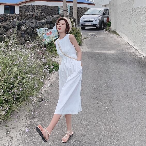 Aラインのロングワンピースはノースリーブでウエストゴム仕様になっています。