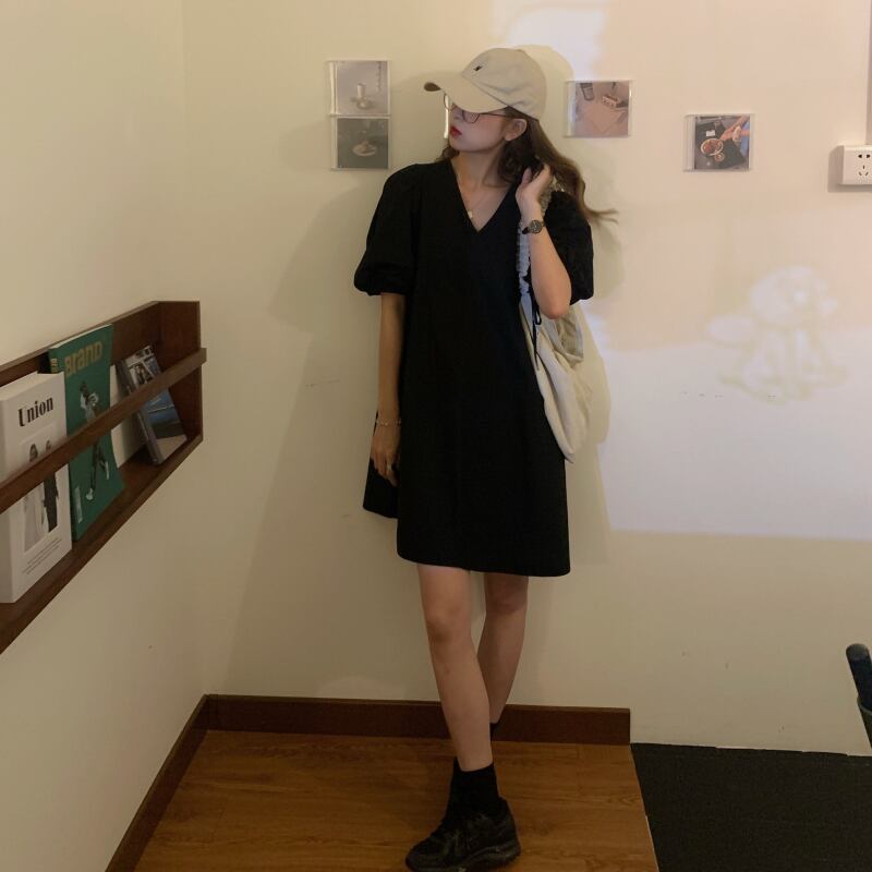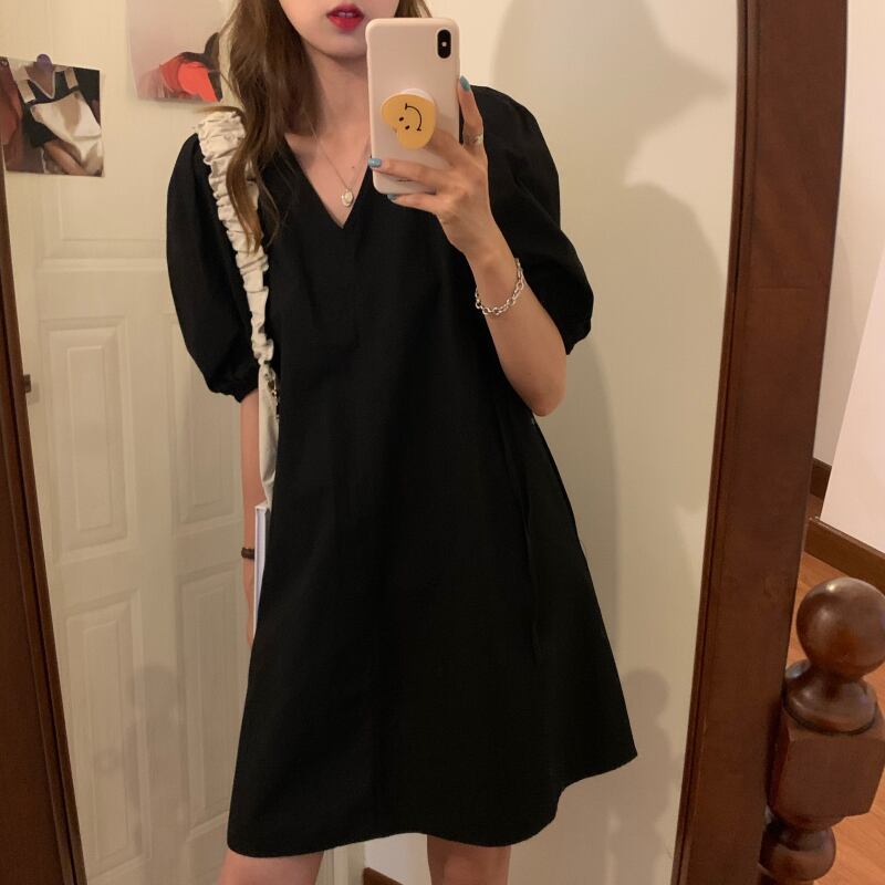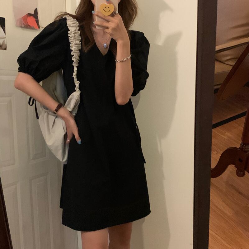 全2色 ワンピース ミニ ワンピ Vネック シンプル 無地 5分袖 パフスリーブ りぼN かわいい レトロ レディース 大人 カジュアル 上品 エレガント クラシカル モノトーン 黒 白 春 夏