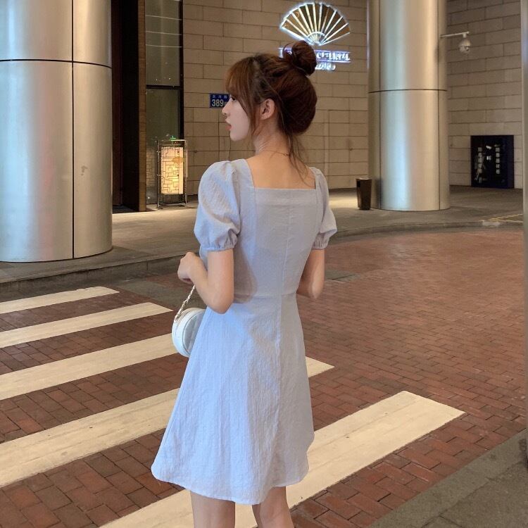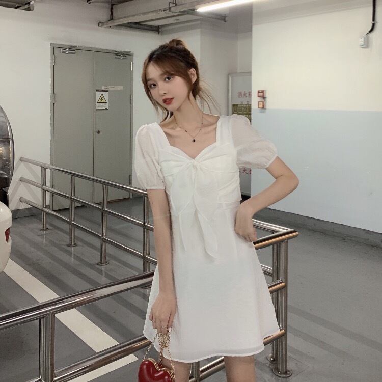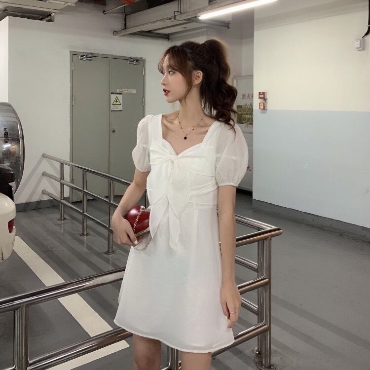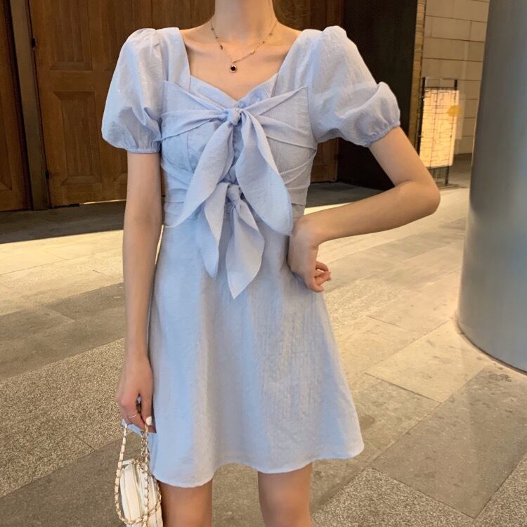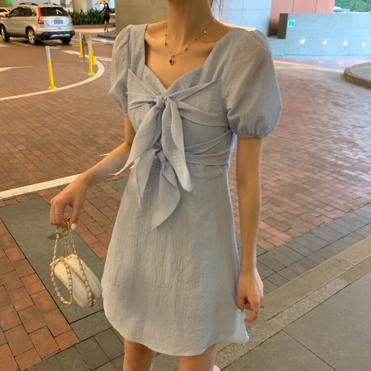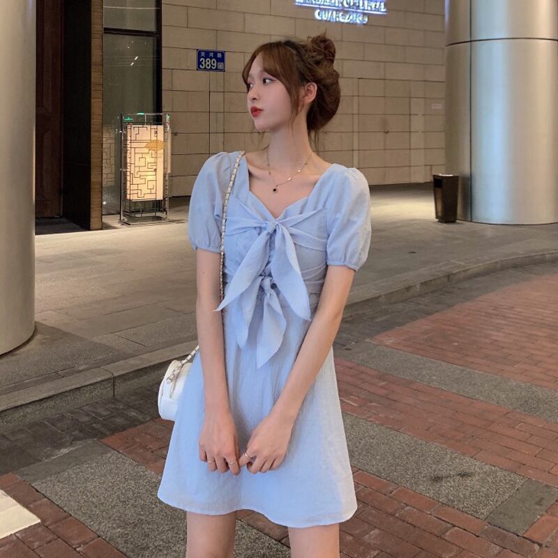 全2色 ワンピース ミニ ワンピ フレア パフスリーブ 半袖 リボン 無地 シンプル レディース 女子 かわいい フェミニン 姫系 ガーリー エレガント おでかけ デート 春 夏