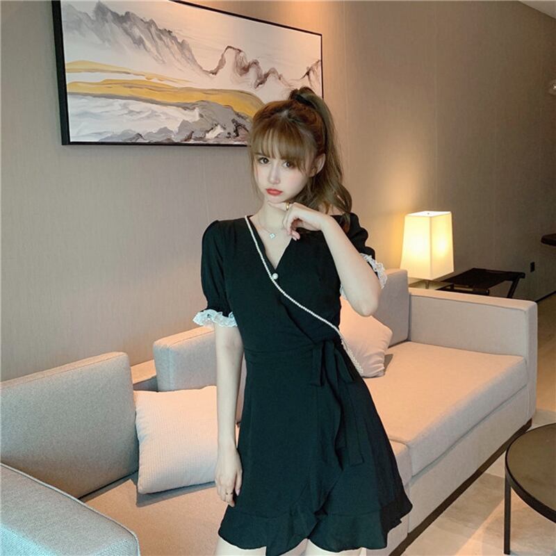 ワンピース ミニ ワンピ 無地 シンプル レース 半袖 バブルスリーブ パフスリーブ フリル Vネック ブラック かわいい 大人 カシュクール ウエストマーク リボン フレア 春 夏 フェミニン 姫系 ゴシック 上品 エレガント