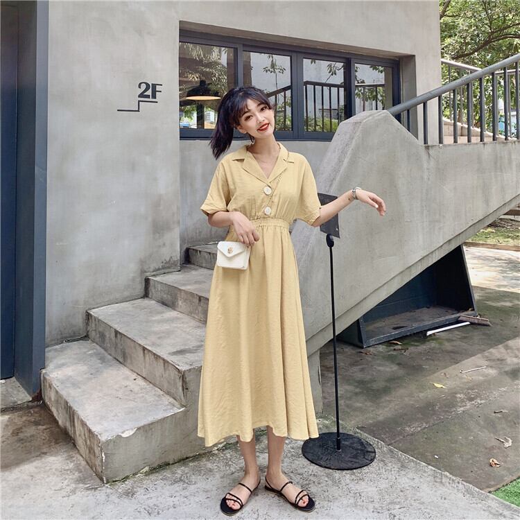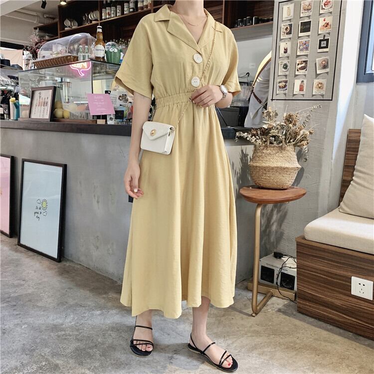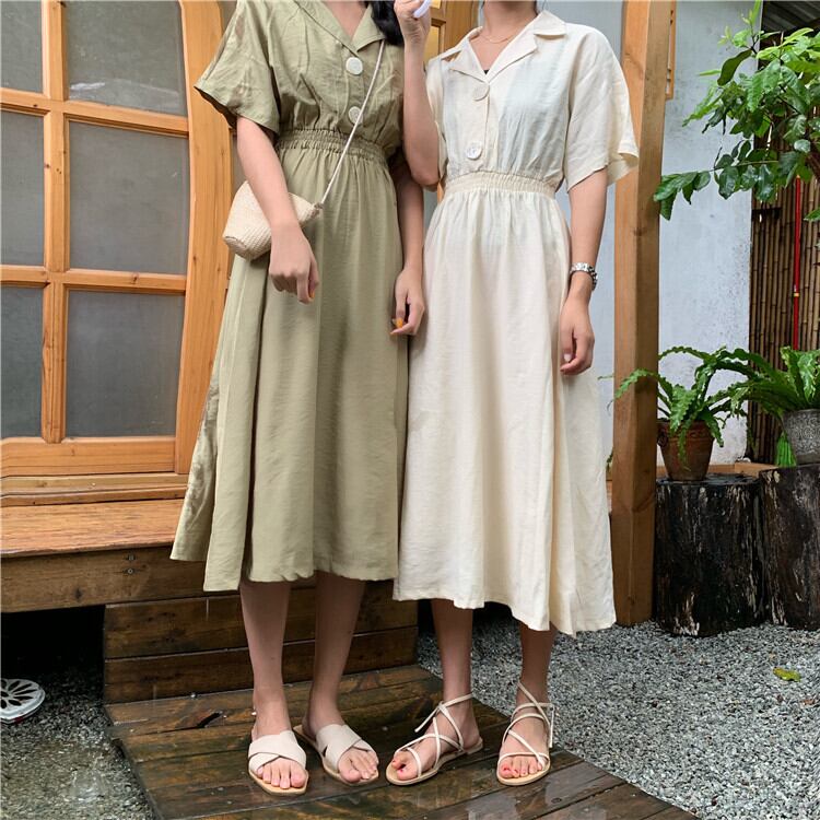 全5色 ワンピース 半袖 ボタン ハイウエスト ロング ワンピ 襟 無地 Aライン フレア シンプル レトロ クラシック クラシカル 大人 レディース かわいい エレガント カジュアル フェミニン おしゃれ ナチュラル 清楚 韓国 春 夏