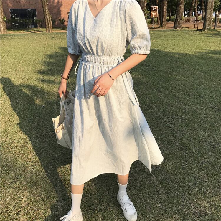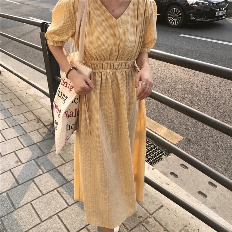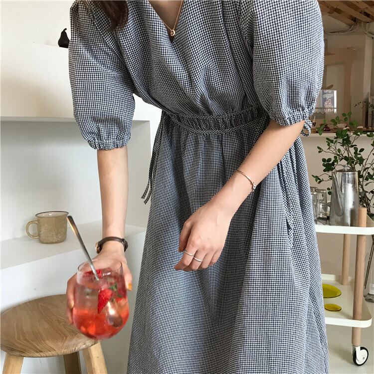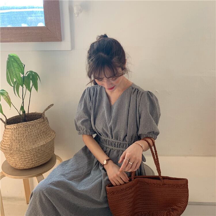細かいチェック柄、Vネック、パフスリーブがオシャレなワンピースはウエストゴム仕様になっています。