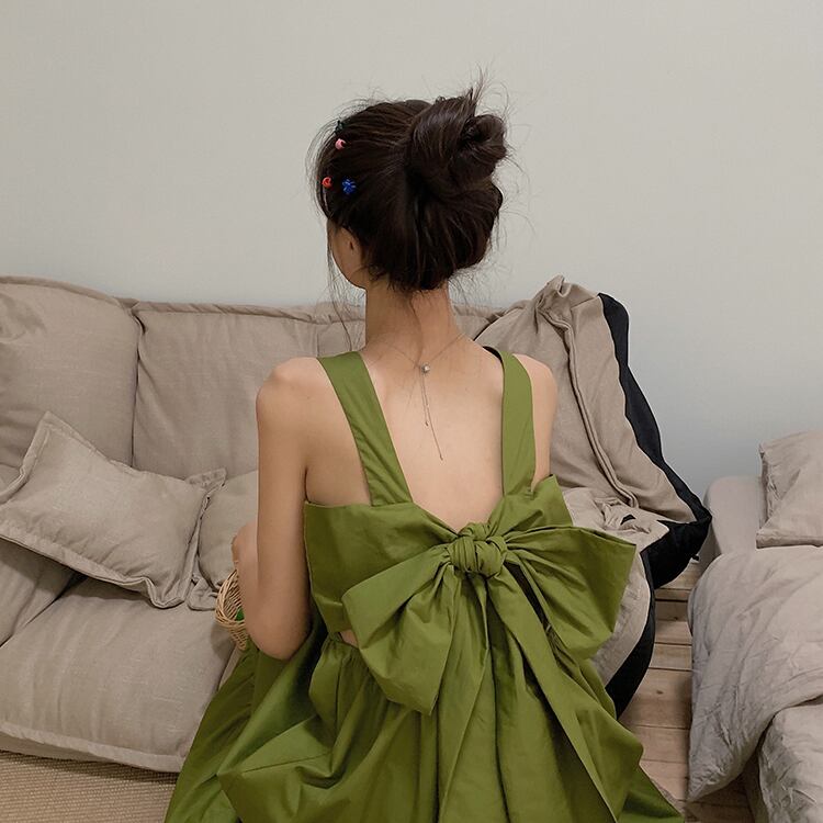 背中開きの大きなリボンがポイントのアイテムです。