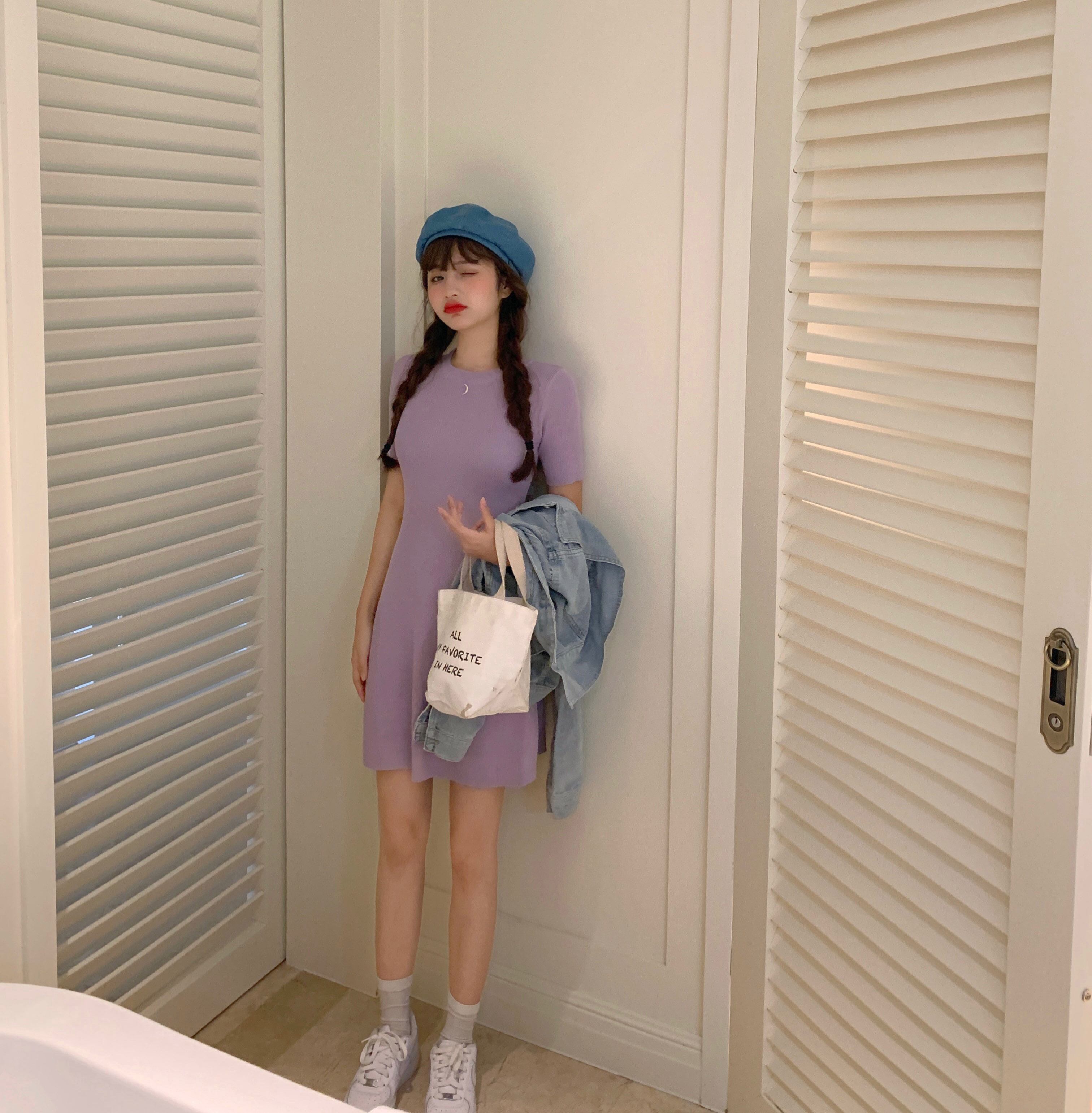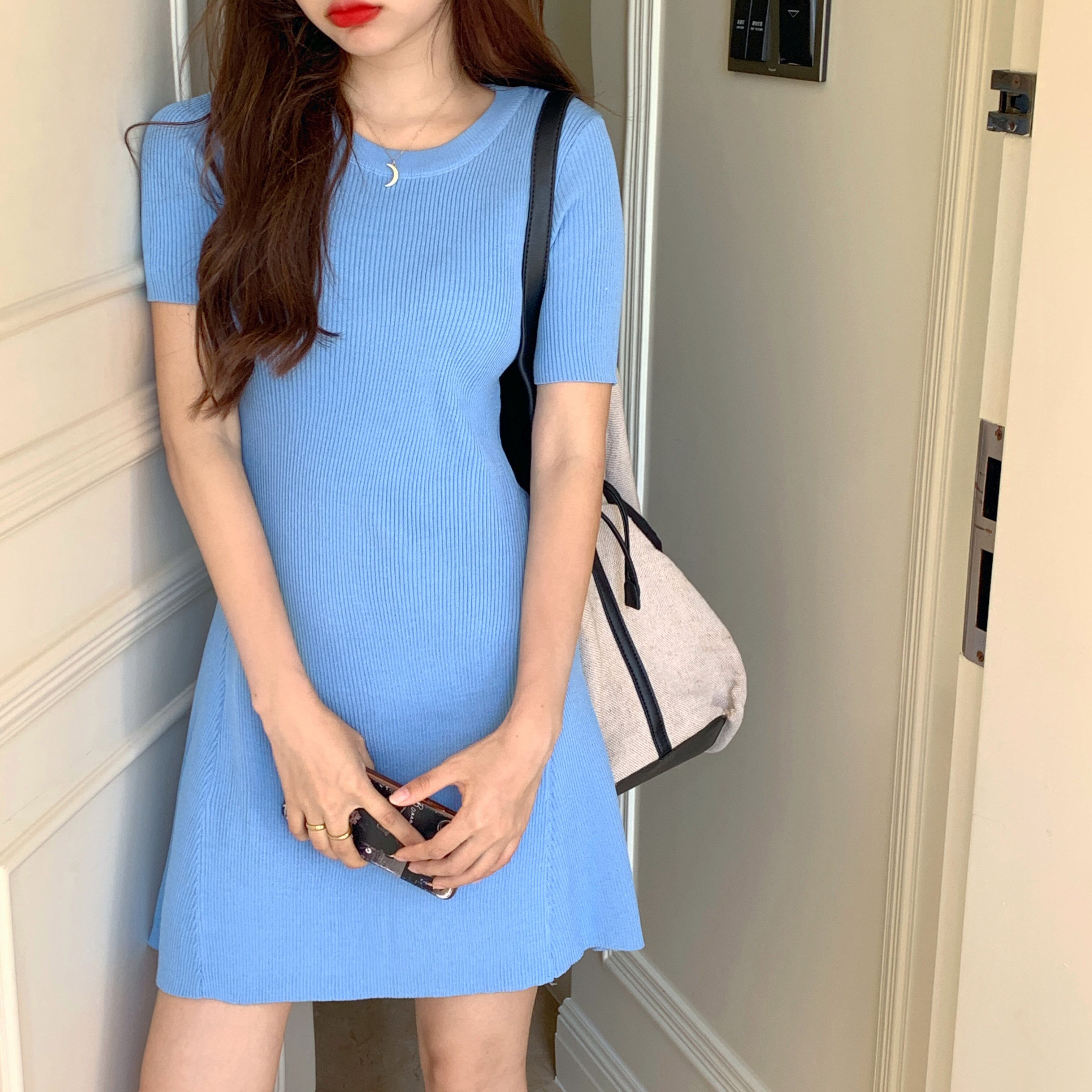 全3色 ワンピース ミニ ワンピ リブニット フレア ラウンドネック シンプル 無地 タイト スリム 膝上 レディース 大人 ガーリー カジュアル 韓国 おしゃれ 春 夏 フェミニン おでかけ レジャー