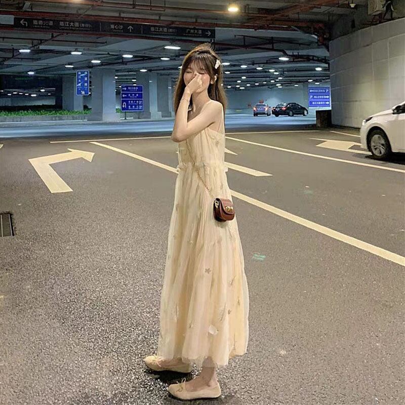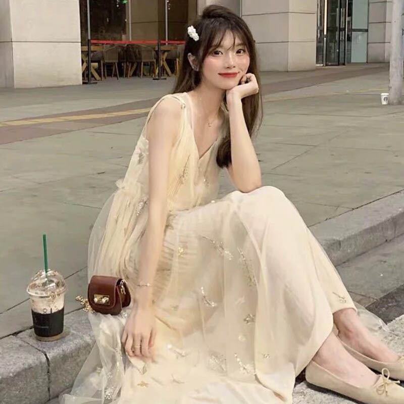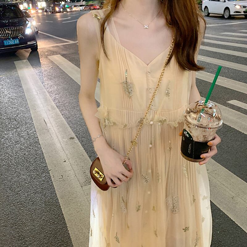 全2種 シフォンワンピース キャミソールワンピース プリーツ ドレス スパンコール 羽 フレア Vネック ノースリーブ ワンピ ロング丈 可愛い 大人可愛い レディース エレガント レトロ フェミニン フォーマル 清楚 上品 お出かけ 通勤 買い物 リゾート 旅行 デート 女子会 夏