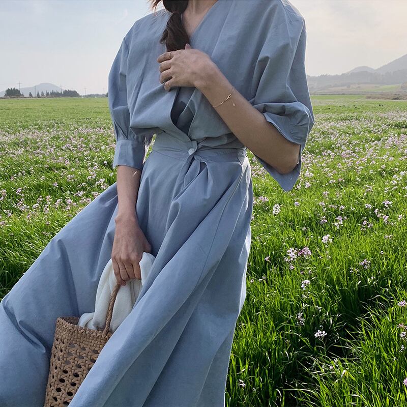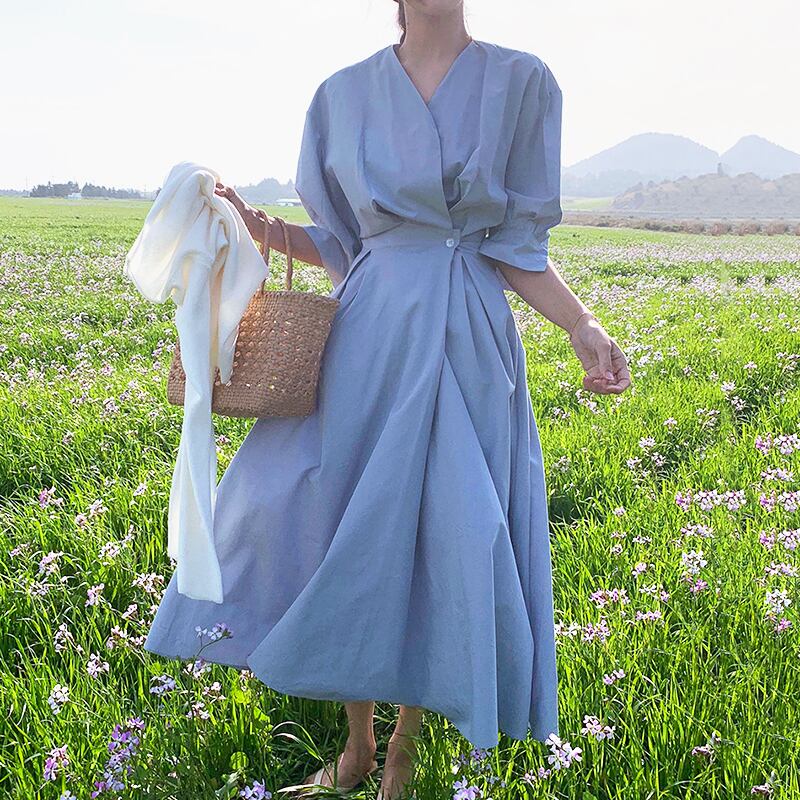 無地 カシュクールワンピース フレア Vネック ゆったり ハイウエスト 七分袖 ワンピ ロング丈 可愛い 大人可愛い レディース きれいめ カジュアル シック レトロ フェミニン キュート 清楚 上品 お出かけ 通勤 買い物 旅行 デート 女子会 夏