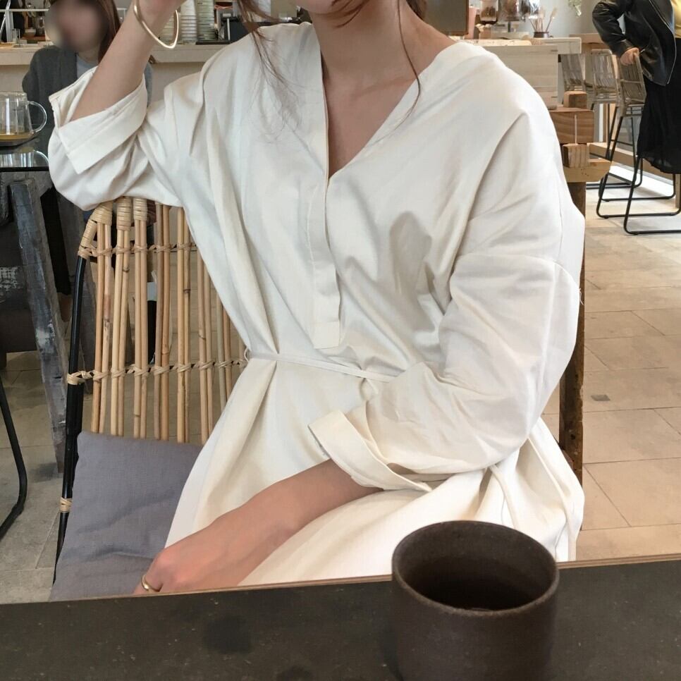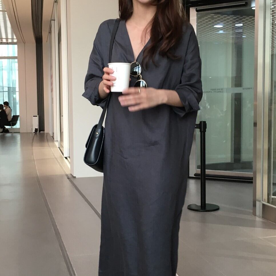全3色 無地 シフォンワンピース ゆったり Vネック ウエストマーク ハイウエスト Aライン 七分袖 ワンピ ロング丈 可愛い 大人可愛い レディース カジュアル きれいめ フェミニン ナチュラル 清楚 上品 お出かけ 通勤 買い物 旅行 デート 女子会 春 夏 秋