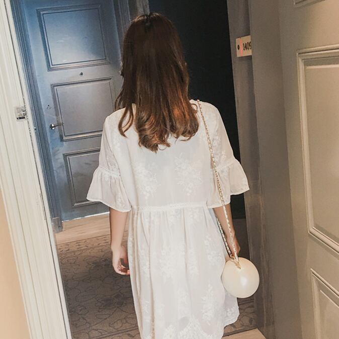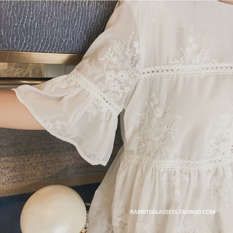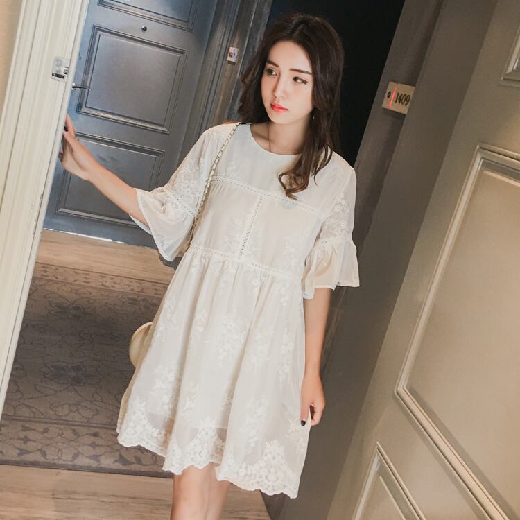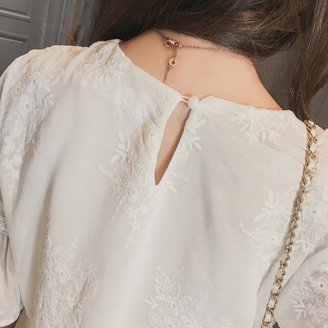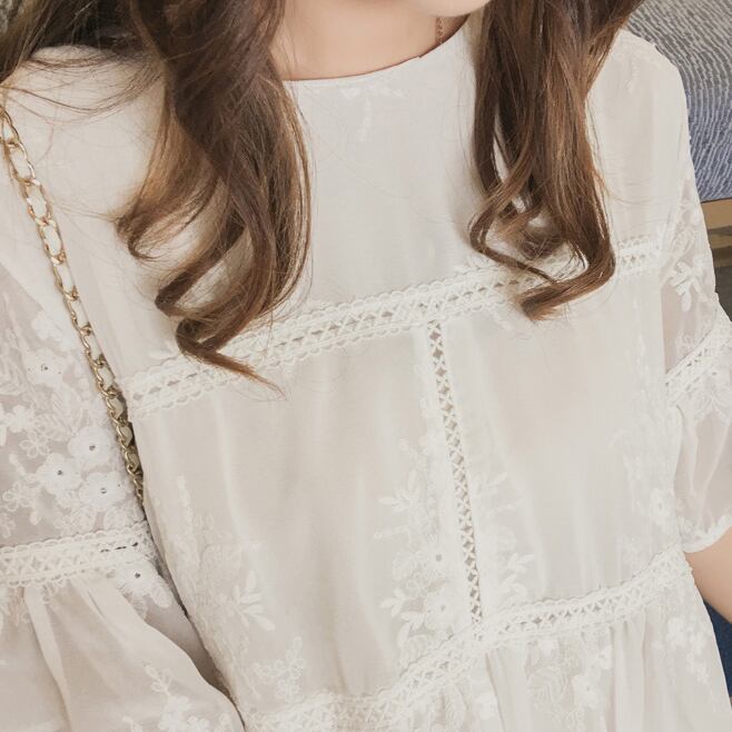 花柄 刺繍 レース シフォンワンピース ゆったり フリル袖 フレア ラウンドネック ハイウエスト Aライン 半袖 ワンピ ショート丈 可愛い 大人可愛い レディース ガーリー フェミニン キュート 清楚 上品 お出かけ 通勤 買い物 リゾート 旅行 デート 女子会 夏