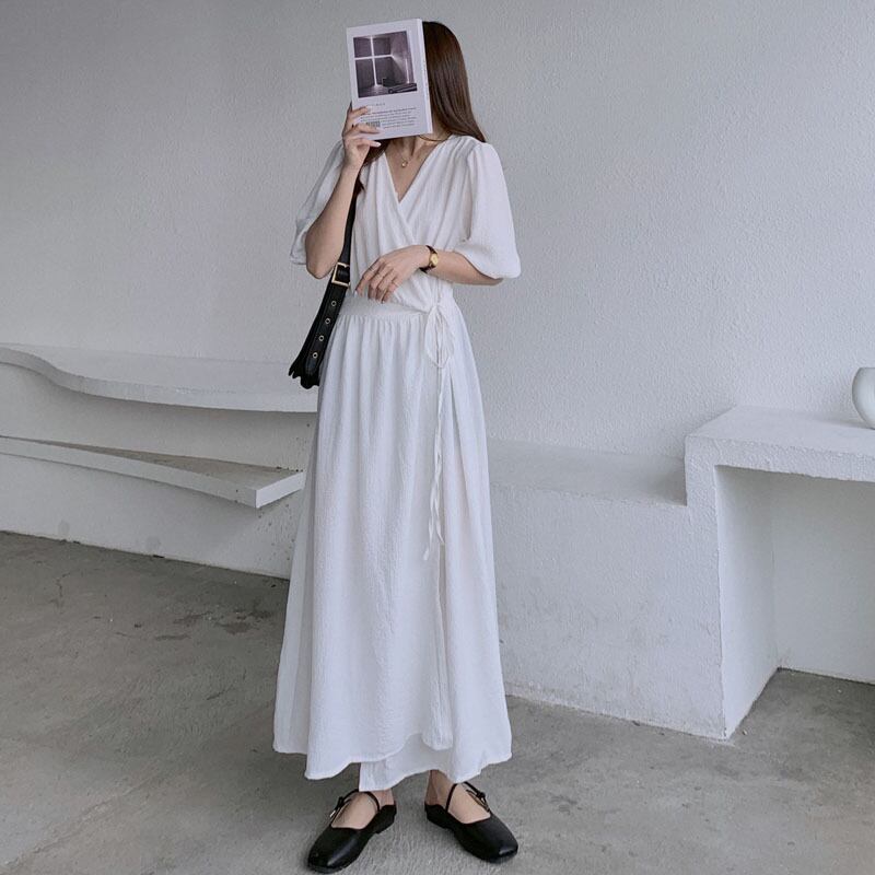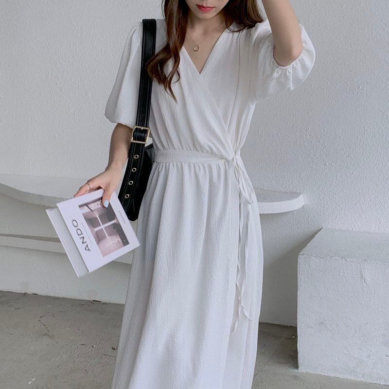 全2色 無地 カシュクール ワンピース ラップワンピ フレア Vネック リボン ハイウエスト Aライン パフスリーブ 半袖 ロングワンピ マキシ丈 可愛い 大人可愛い レディース カジュアル ナチュラル きれいめ フェミニン キュート 清楚 上品 お出かけ 通勤 買い物 旅行 デート 女子会 夏