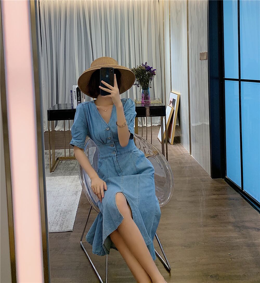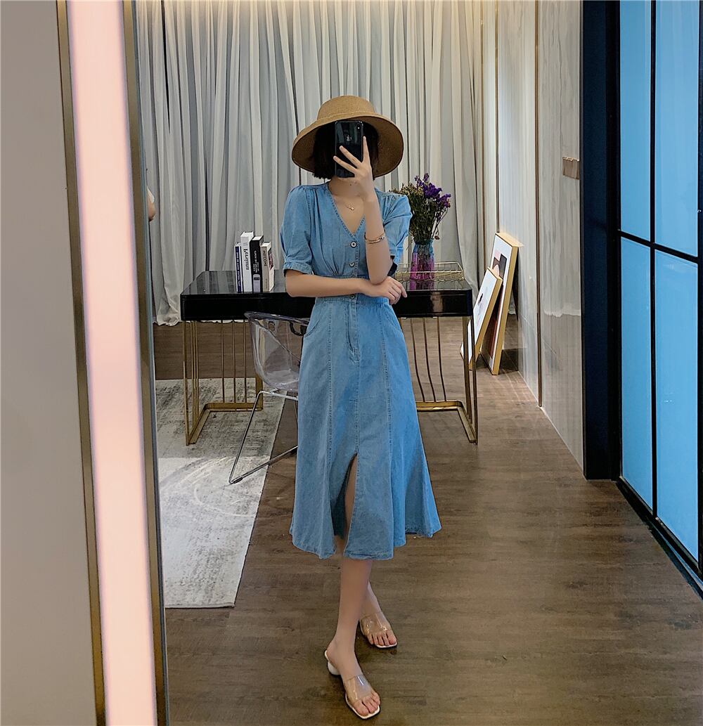 Vネック、パフスリーブの組み合わせで、大人フェミニンなデニムワンピース♪
