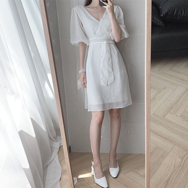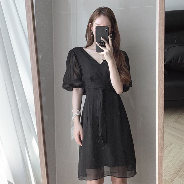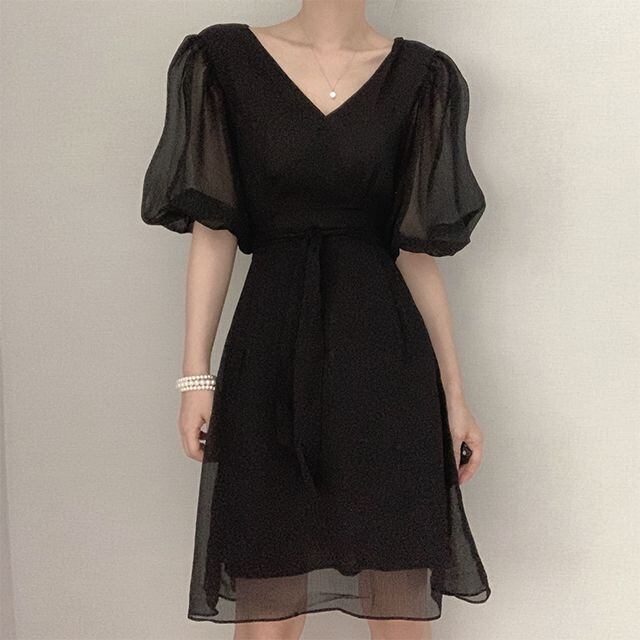 全3色 シフォンワンピース ボリューム袖 透け感 フレア Vネック バックリボン ハイウエスト 半袖 ワンピ ショート丈 可愛い 大人可愛い レディース エレガント フォーマル レトロ フェミニン キュート 上品 お出かけ 通勤 買い物 お呼ばれ パーティー デート 女子会 夏
