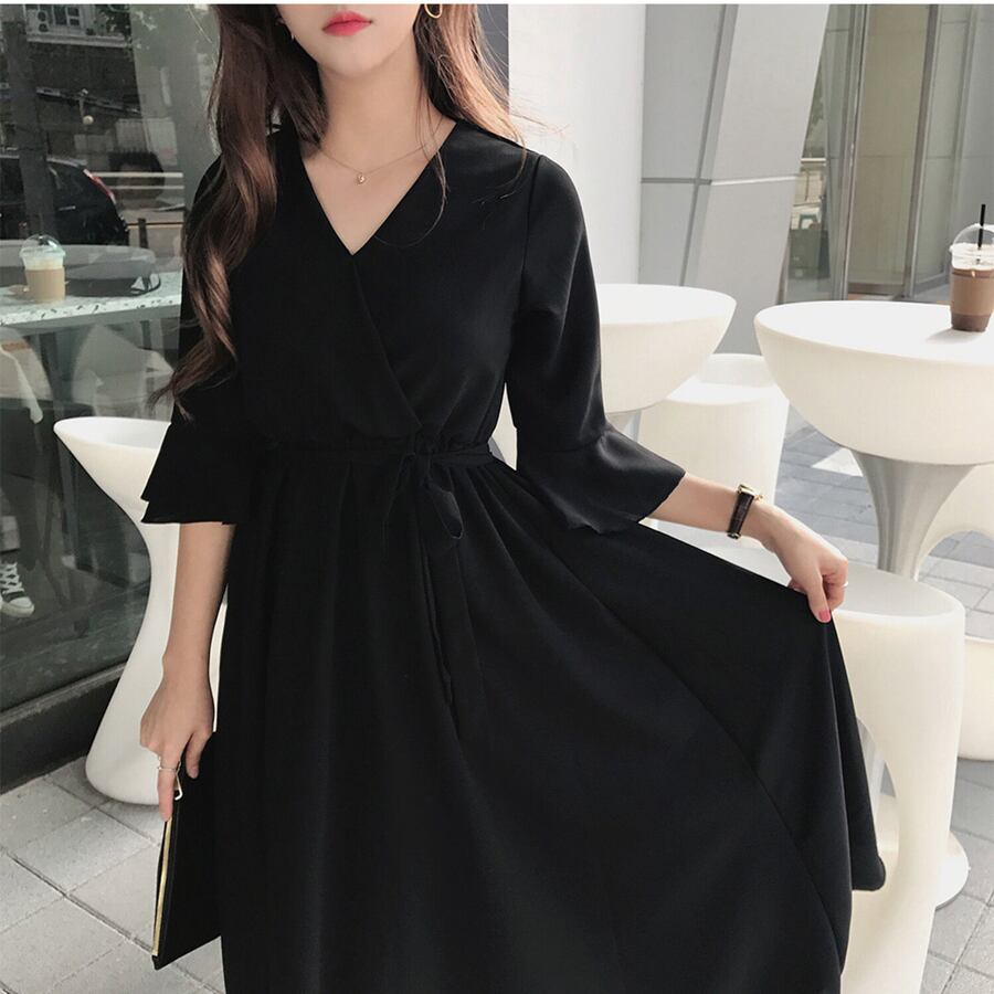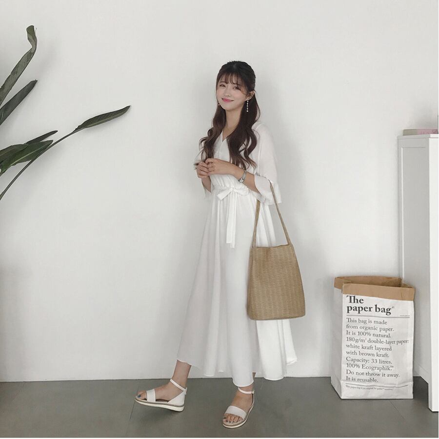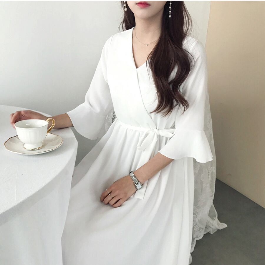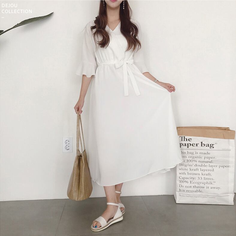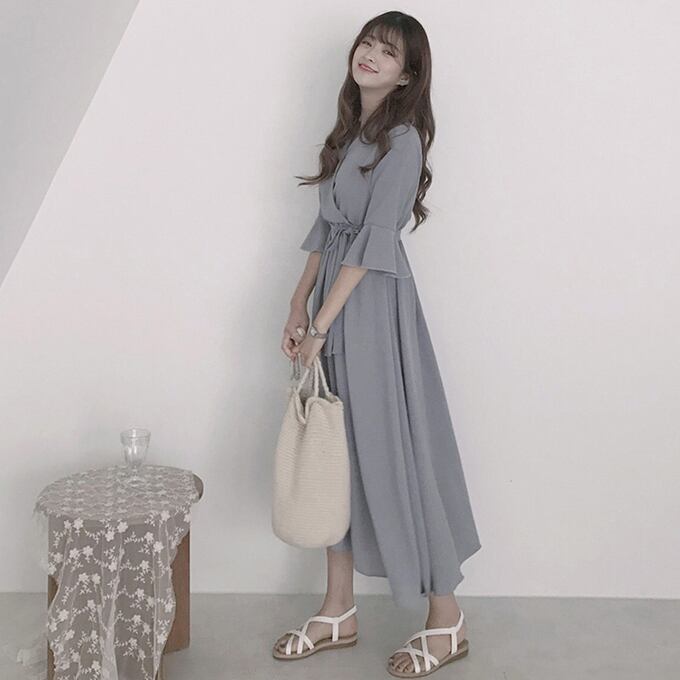 全3色 カシュクール シフォンワンピース フリル袖 フレア Vネック リボン ハイウエスト Aライン ホーンスリーブ 七分袖 ワンピ ロング丈 可愛い 大人可愛い レディース きれいめ フォーマル フェミニン キュート 清楚 上品 お出かけ 通勤 買い物 お呼ばれ パーティー 旅行 デート 女子会 大きいサイズ 夏