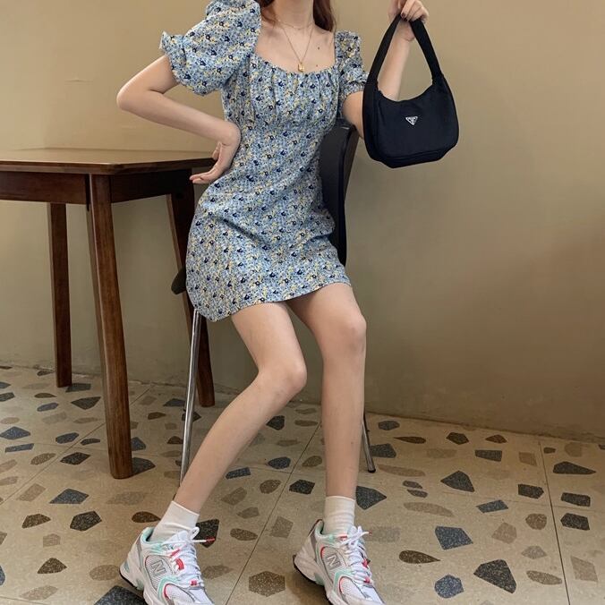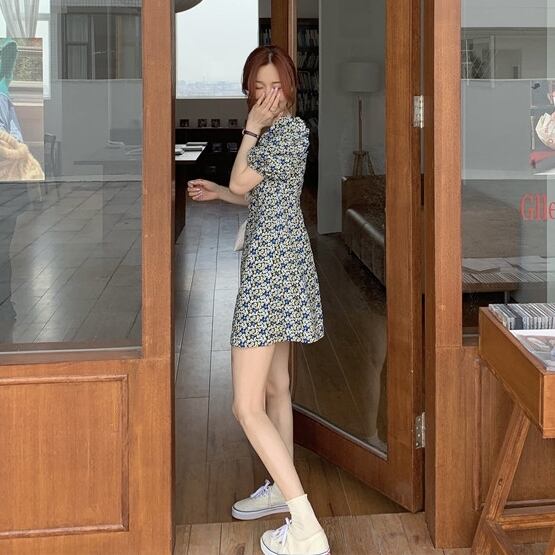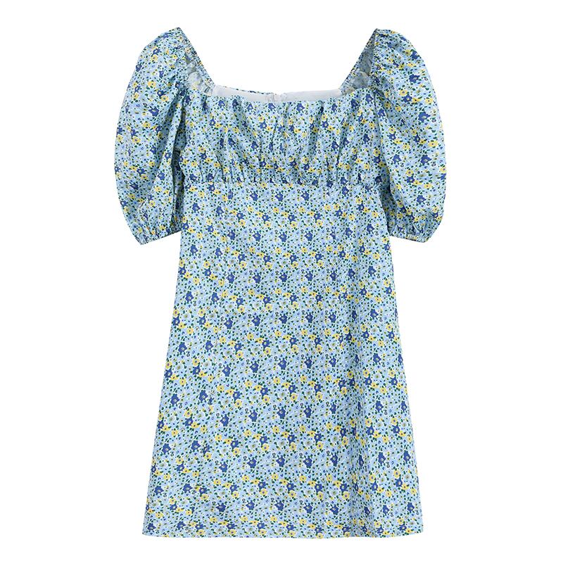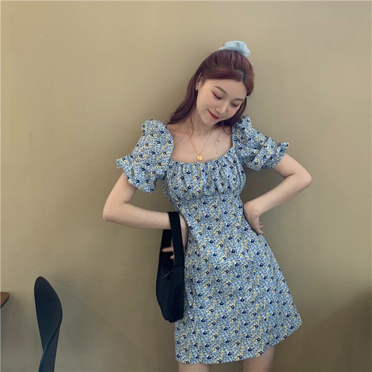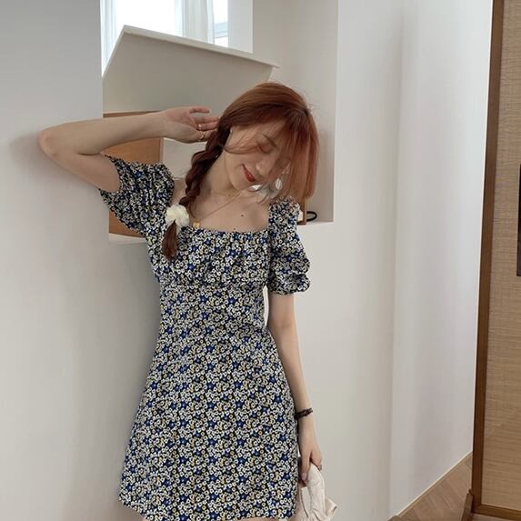 全2色 ワンピース ミニ ワンピ 花柄 フラワー柄 スクエアカラー パフスリーブ ハイウエスト Aライン バブルスリーブ かわいい ガーリー レトロ フェミニン おしゃれ おでかけ デート フローラル 安い 春 夏