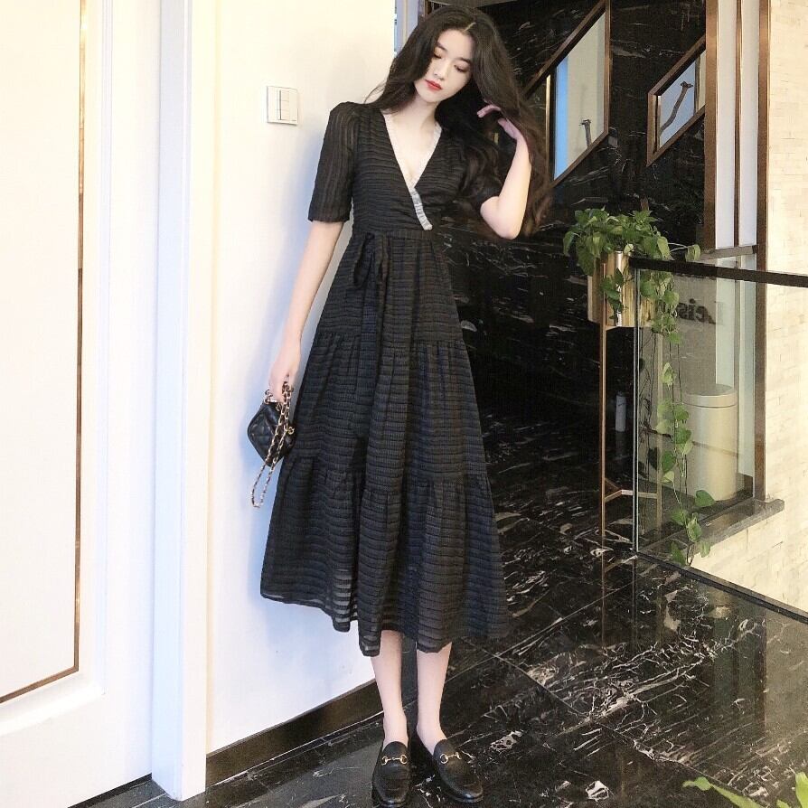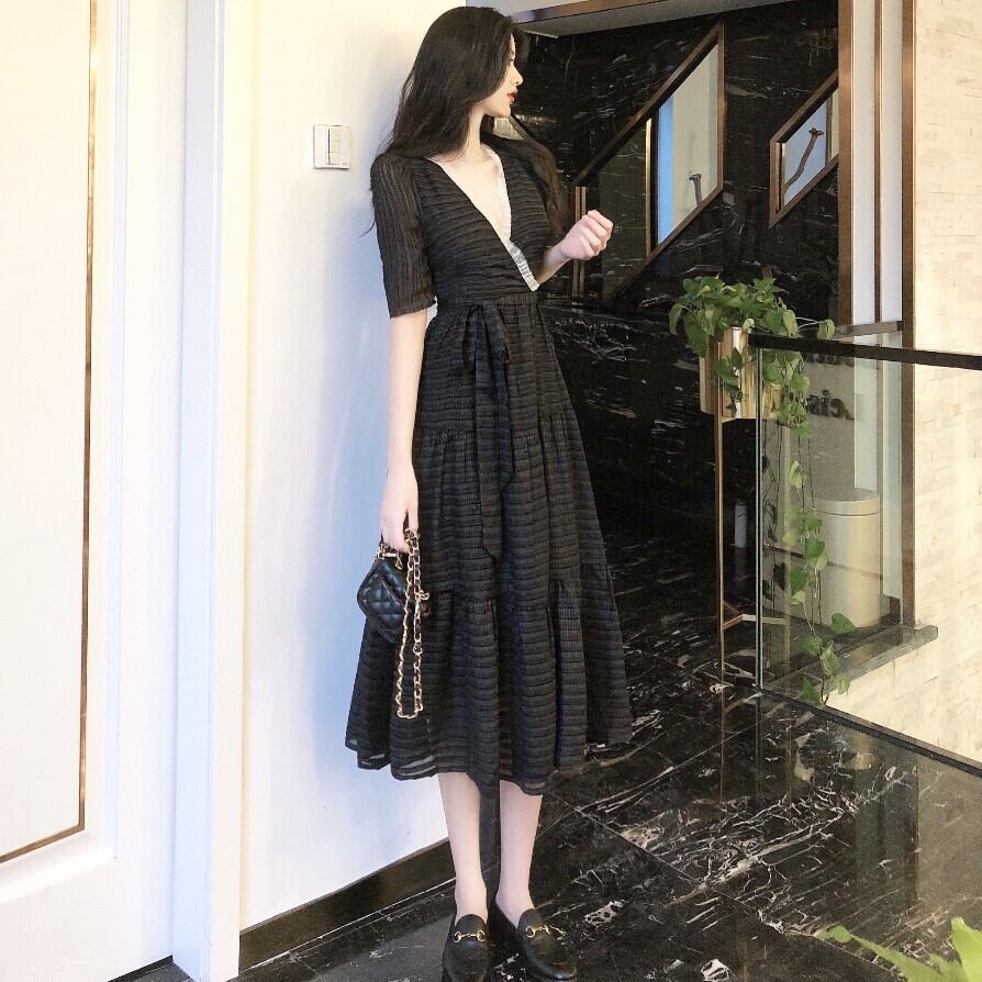 ワンピース ロング ワンピ ボーダー ストライプ シースルー ティアード ウエスト リボン Vネック 5分袖 カシュクール フレア Aライン ブラック レース 黒 大人 レディース エレガント カジュアル フェミニン クラシック クラシカル お呼ばれ デート 女子会 フォーマル パーティー 春 夏 秋