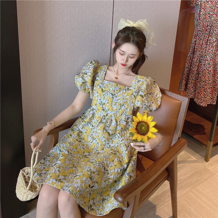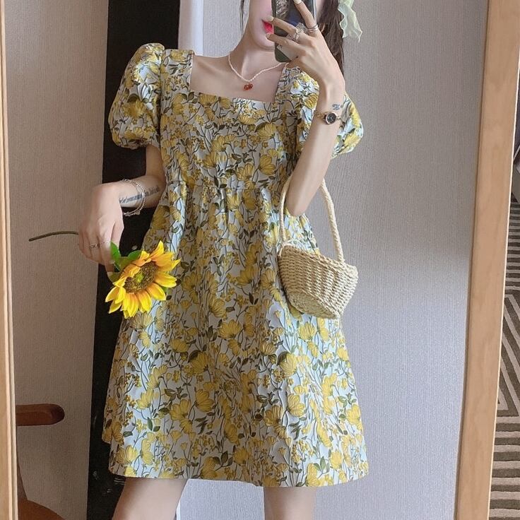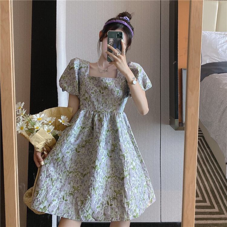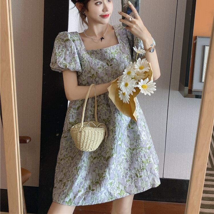 全2色 花柄 ボタニカル柄 ワンピース フラワー柄 スクエアカラー パフスリーブ バブルスリーブ Aライン フレア ワンピ ミニ 膝上 ハイウエスト おでかけ デート 旅行 女子会 かわいい おしゃれ 春 夏