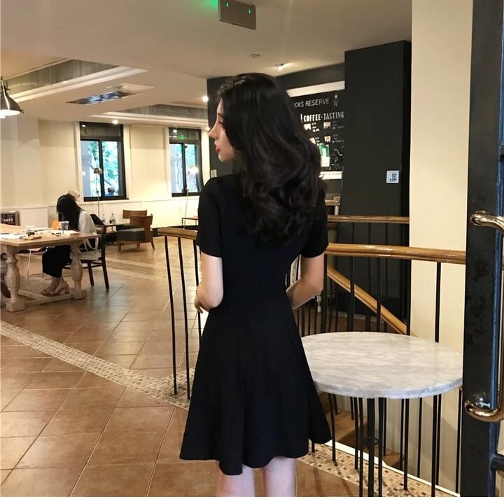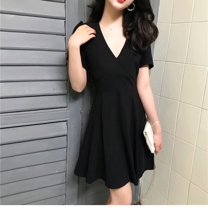Vネック ブラック シフォンワンピース デコルテ フレア ハイウエスト Aライン 半袖 ワンピ ショート丈 可愛い 大人可愛い シンプル きれいめ レディース レトロ フェミニン カジュアル フォーマル お出かけ 買い物 旅行 デート 女子会 大きいサイズ 夏