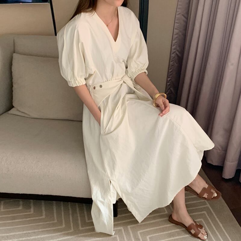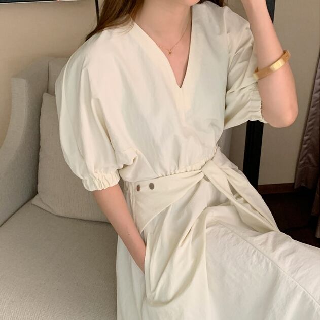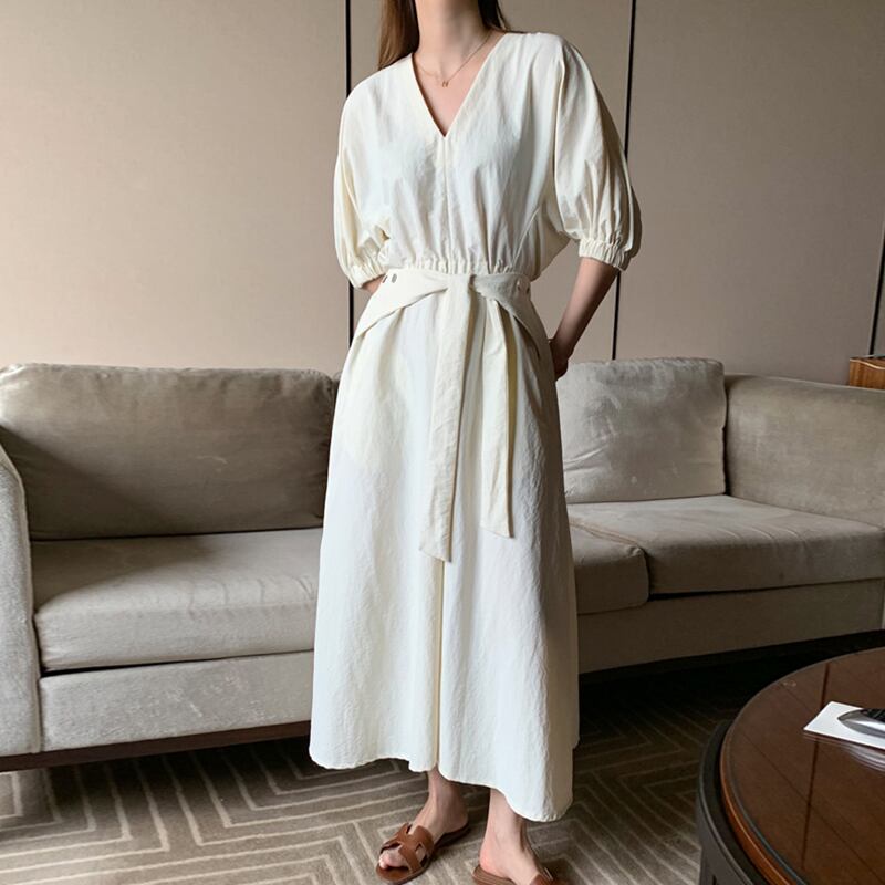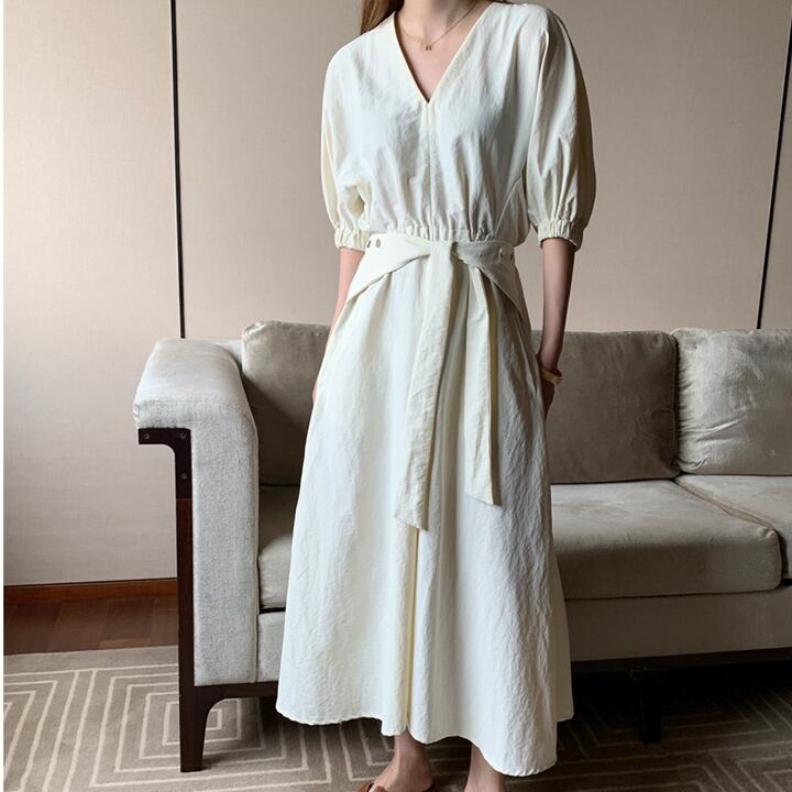 ワンピース Vネック ウエストマーク リボン スリット 無地 シンプル ロング ワンピ 5分袖 パフスリーブ ゴム 大人 レディース ナチュラル エレガント 上品 カジュアル ホワイト 白 春 夏