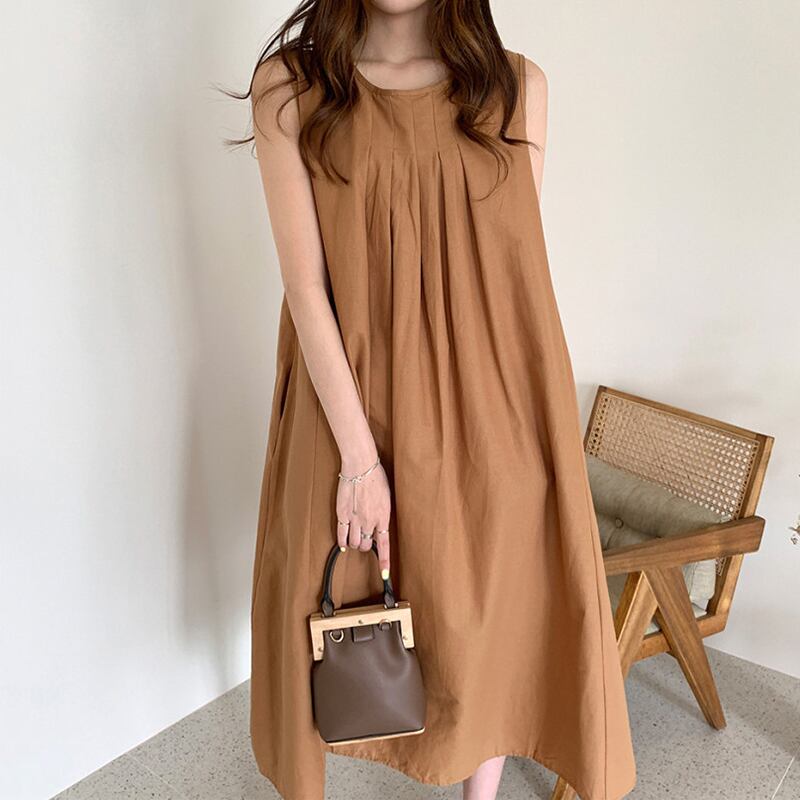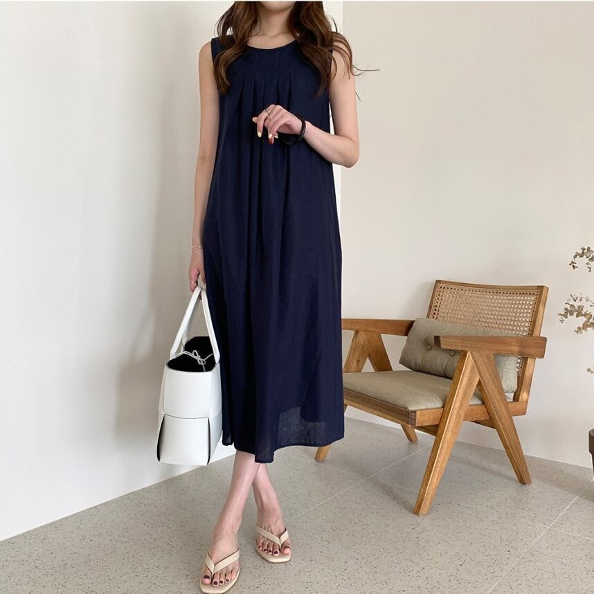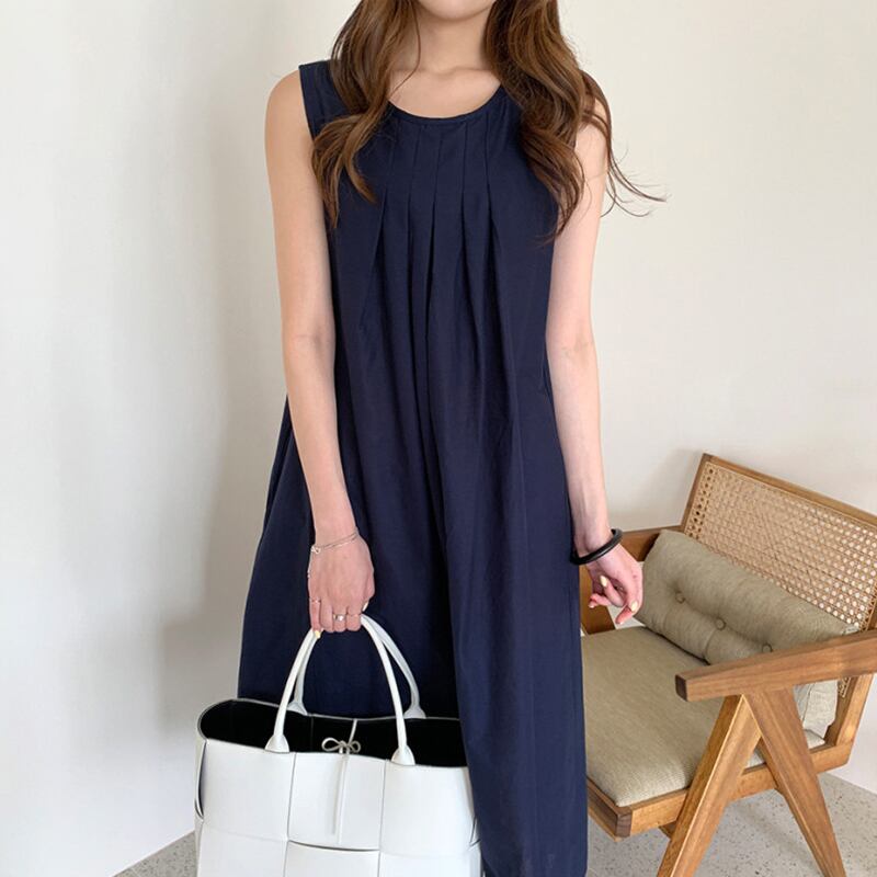 全3色 ワンピース ノースリーブ ラウンドネック タック ギャザー シンプル 無地 ロング ワンピ 膝下 Aライン ハイウエスト 大人 レディース かわいい 上品 エレガント カジュアル おしゃれ カジュアル 春 夏 おでかけ レジャー 女子会