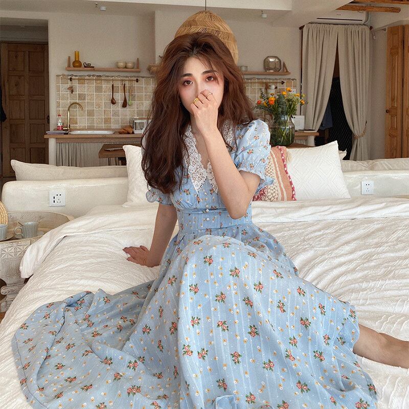 全2色 ワンピース 花柄 Vネック レース ロング ワンピ パフスリーブ バブルスリーブ レトロ 上品 エレガント フラワー柄 フローラル ウエストシェイプ かわいい ガーリー フリル フレア 大人 レディース お呼ばれ 女子会 カフェ おでかけ 春 夏