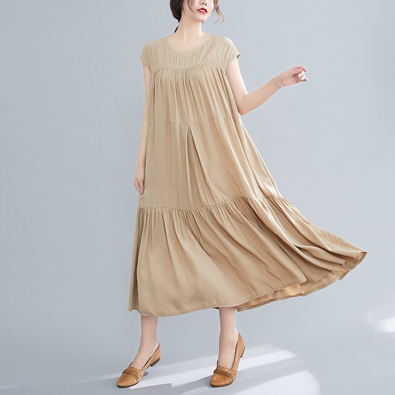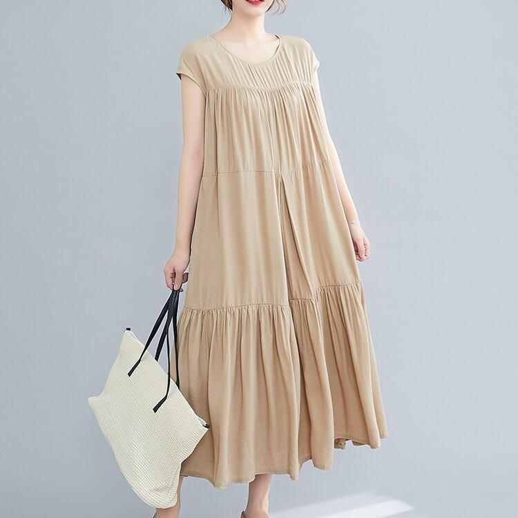ワンピース Aライン 半袖 フレア ラウンドネック ボタン ティアード風 ゆったり 大きいサイズ ロング ワンピ ベージュ 無地 シンプル カジュアル 大人 エレガント 上品 おでかけ レジャー 春 夏