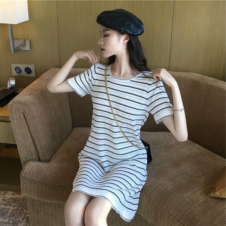 全2色 ワンピース 半袖 ボーダー 膝上 Aライン スリム タイト カジュアル かわいい モノトーン 上品 おしゃれ エレガント ストライプ ラウンドネック 大きいサイズ プラスサイズ クラシカル シック 春 夏