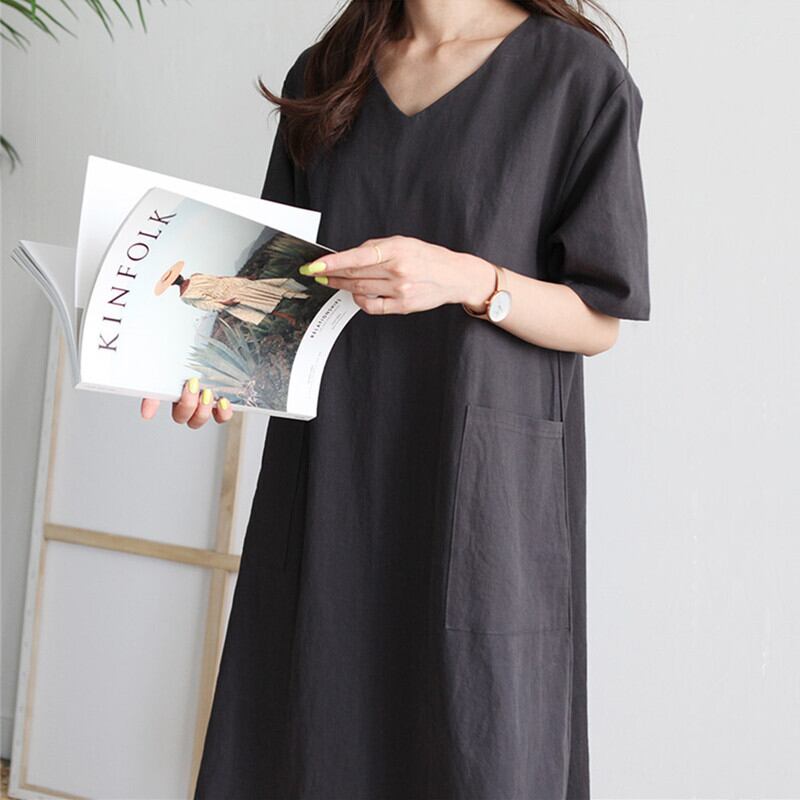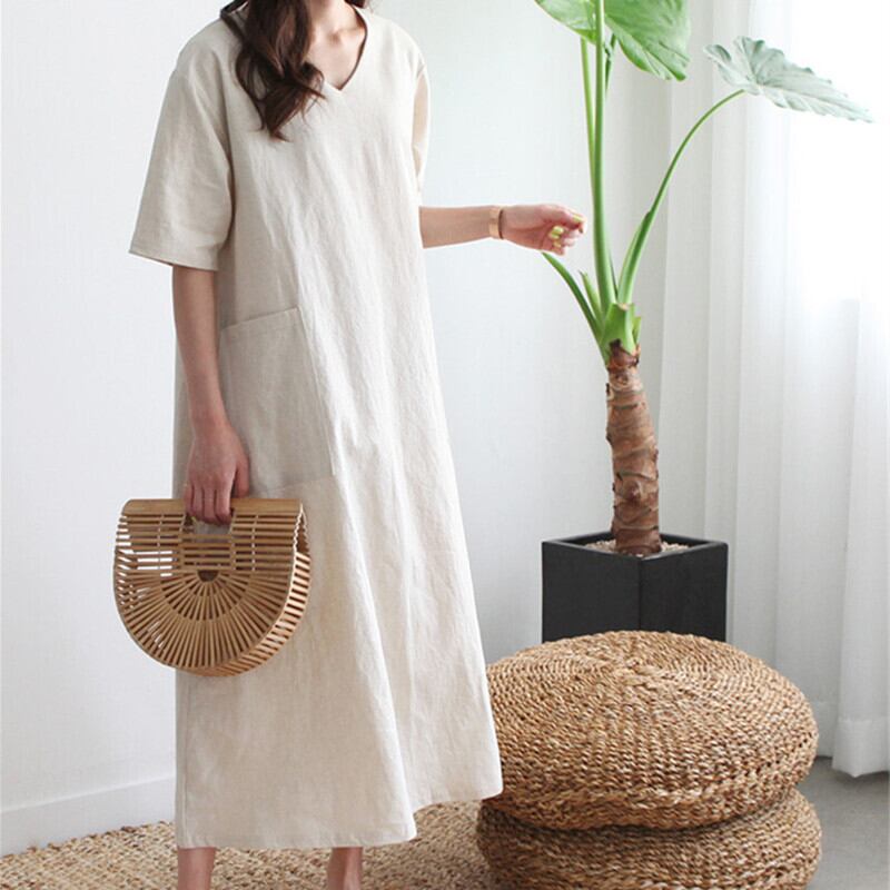 全3色 ワンピース ポケット 半袖 Aライン Vネック ナチュラル リネン ワンピ 膝下 ロング 無地 シンプル