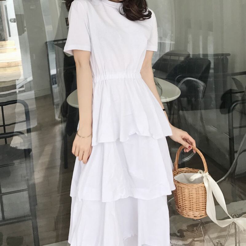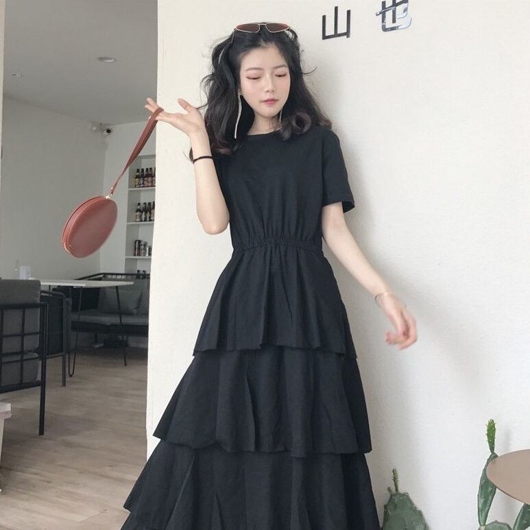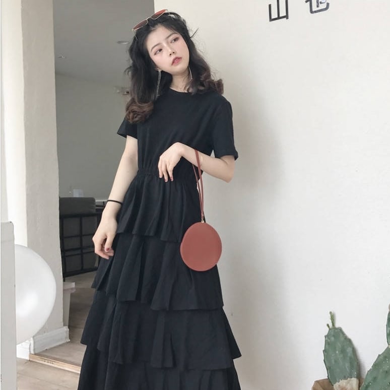 全2色 ワンピース フリル 段フリル ロング ワンピ ティアード 無地 シンプル ラウンドネック Aライン フレア 大人 レディース エレガント 上品 かわいい ガーリー クラシカル シック おでかけ デート レジャー 女子会 モノトーン 春 夏 大きいサイズ プラスサイズ