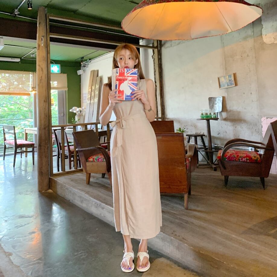 全3色 ワンピース ロング ノースリーブ ワンピ スリット ラップスカート タイト スリム ウエストマーク リボン 大人 レディース エレガント 上品 クラシカル シック 無地 シンプル おしゃれ 春 夏 旅行 デート 女子会 おでかけ ワンサイズ