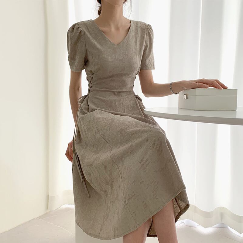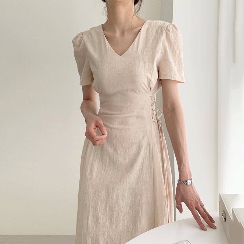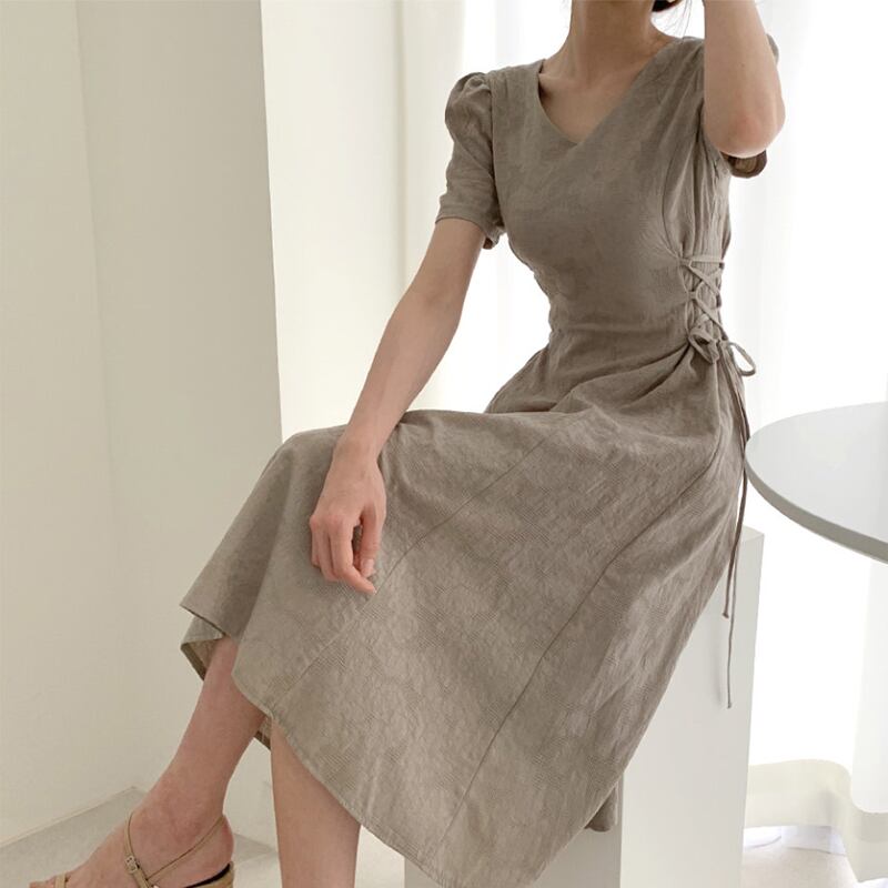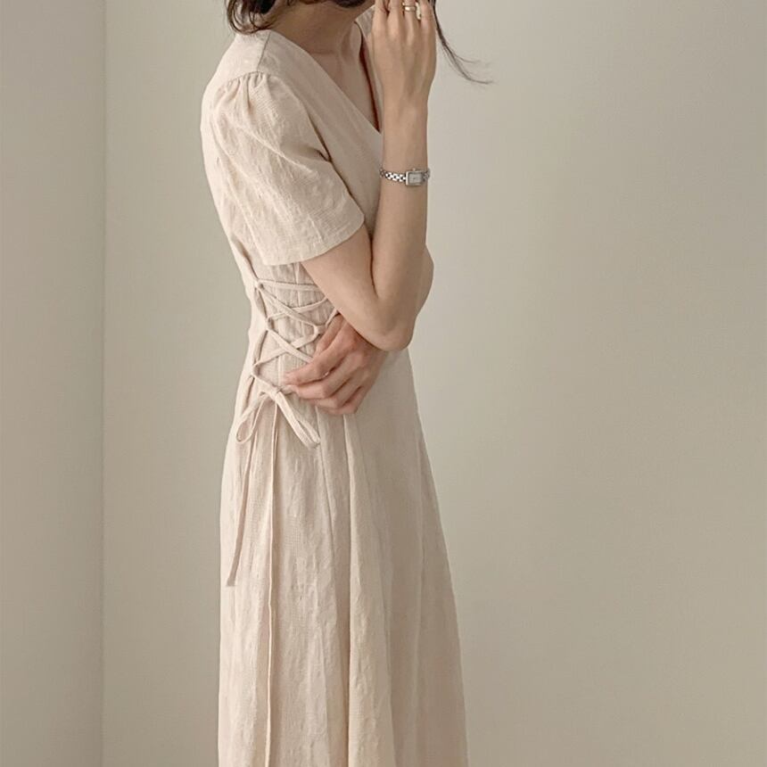 全2色 ワンピース 半袖 ロング ワンピ レースアップ 紐 シンプル ナチュラル Vネック ハイウエスト 美ライン 大人 レディース おしゃれ かわいい エレガント 上品 クラシカル レトロ 春 夏 フレア Aライン